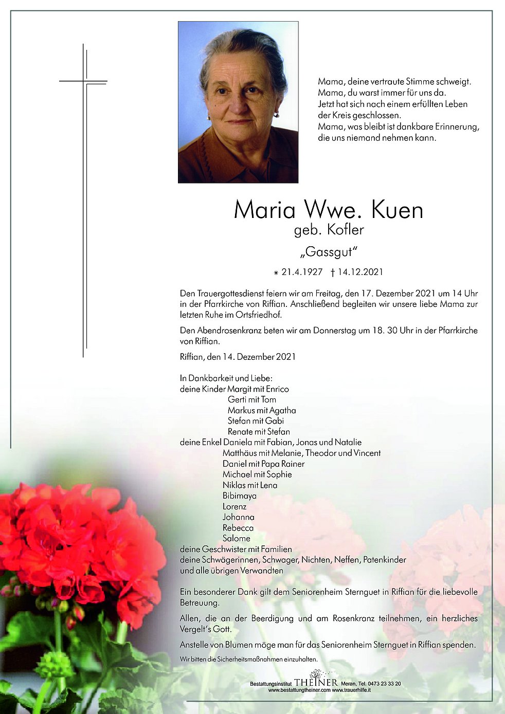 Den Trauergottesdienst feiern wir am Freitag, den 17. Dezember 2021 um 14 Uhr in der Pfarrkirche von Riffian. Anschließend begleiten wir unsere liebe Mama zur letzten Ruhe im Ortsfriedhof.