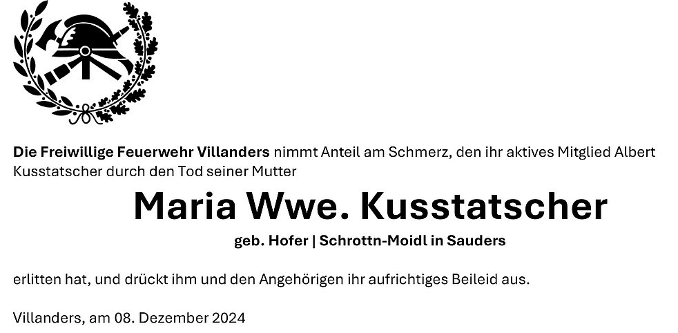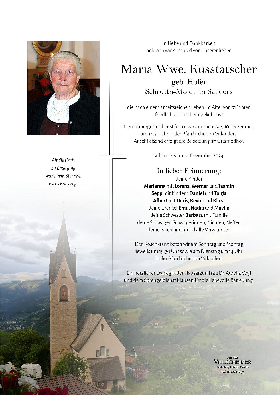 Begräbnisgottesdienst: 10.12. - 14:30 Uhr Villanders