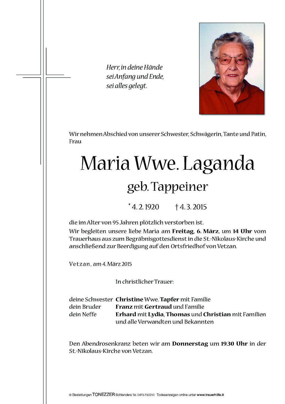 die im Alter von 95 Jahren plötzlich verstorben ist. Wir begleiten unsere liebe Maria am Freitag, 6. März, um 14 Uhr vom Trauerhaus aus zum Begräbnisgottesdienst in die St.-Nikolaus-Kirche und anschließend zur Beerdigung auf den Ortsfriedhof von Vetzan.