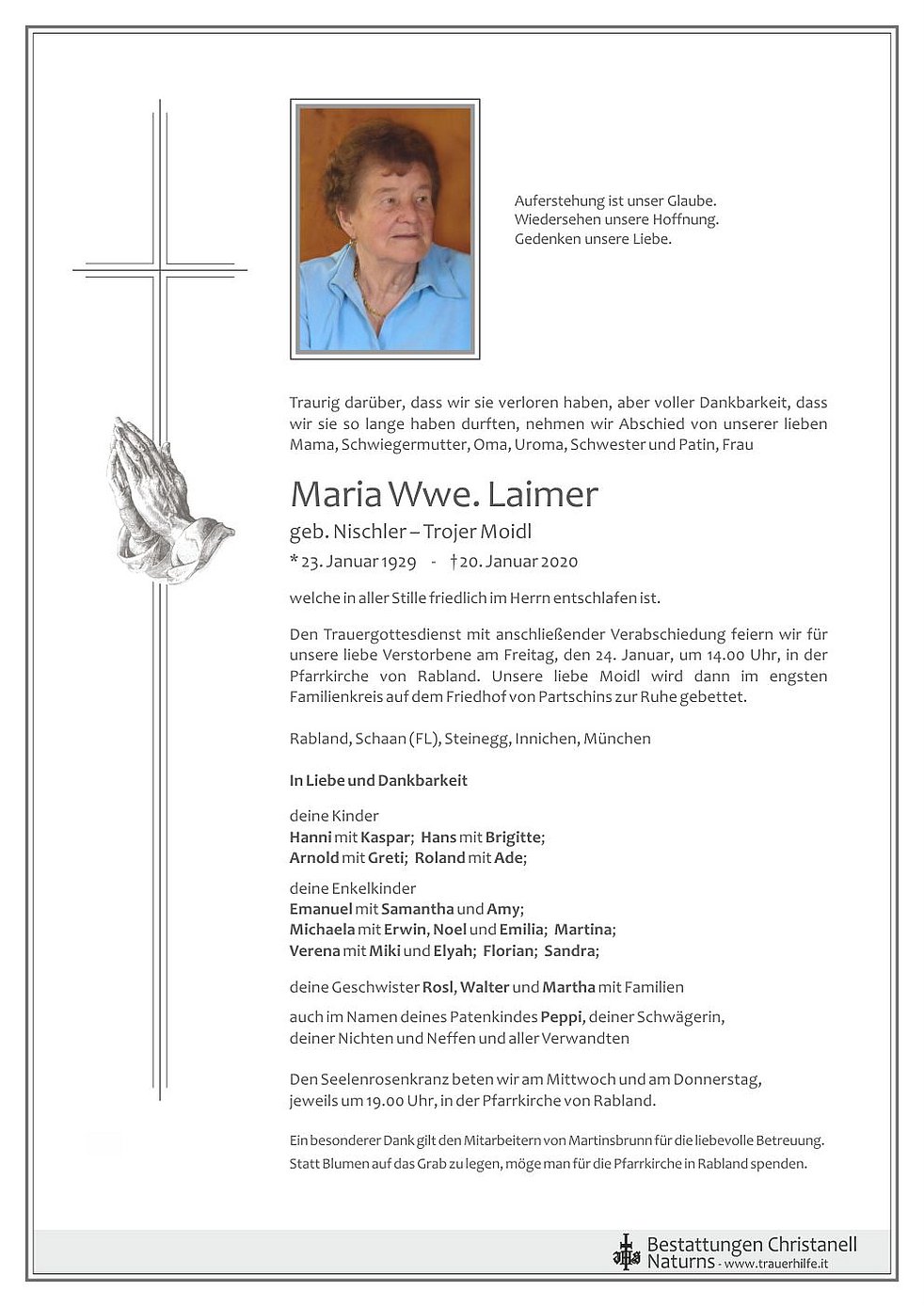 Den Trauergottesdienst mit anschließender Verabschiedung feiern wir für unsere liebe Verstorbene am Freitag, den 24. Januar, um 14.00 Uhr, in der Pfarrkirche von Rabland. Unsere liebe Moidl wird dann im engsten Familienkreis auf dem Friedhof von Partschins zur Ruhe gebettet.