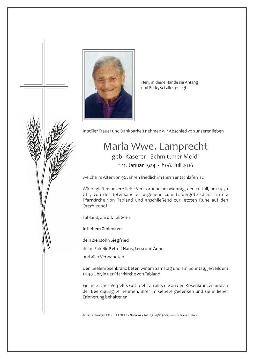Wir begleiten unsere liebe Verstorbene am Montag, den 11. Juli, um 14.30 Uhr, von der Totenkapelle ausgehend zum Trauergottesdienst in die Pfarrkirche von Tabland und anschließend zur letzten Ruhe auf den Ortsfriedhof.