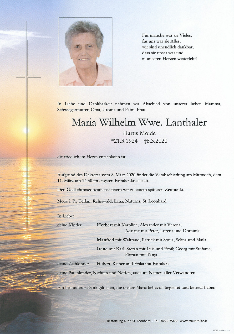 Aufgrund des Dekretes vom 8. März findet die Verabschiedung am Mittwoch, dem 11. März um 14.30 Uhr im engsten Familienkreis statt.