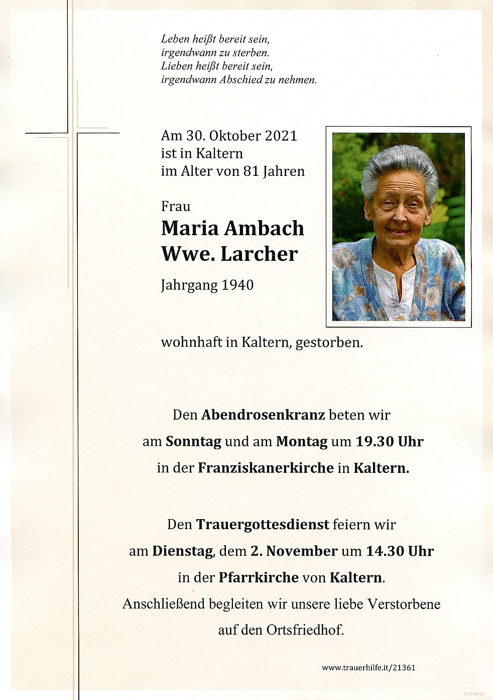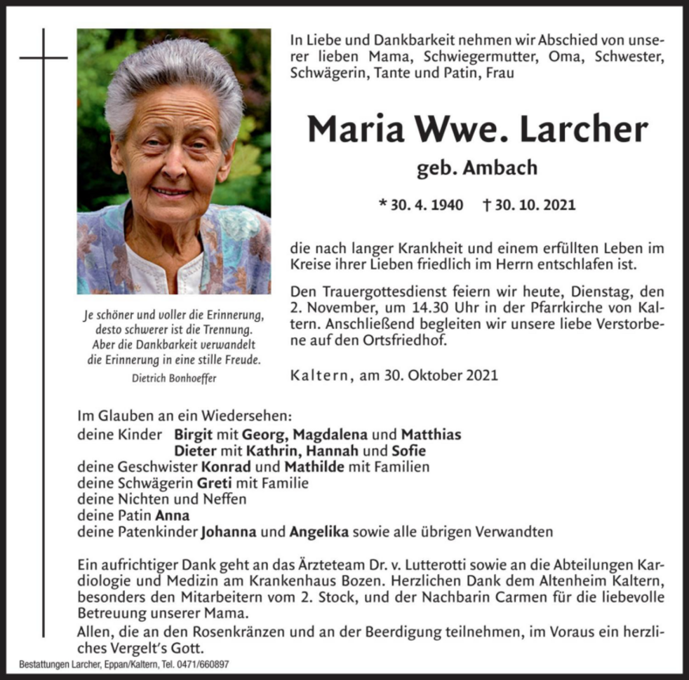 Den Trauergottesdienst feiern wir am Dienstag, dem 2. November um 14.30 Uhr in der Pfarrkirche von Kaltern. Anschließend begleiten wir unsere liebe Verstorbene auf den Ortsfriedhof.