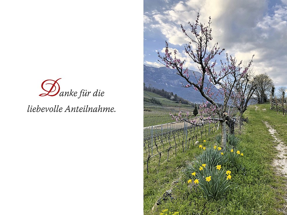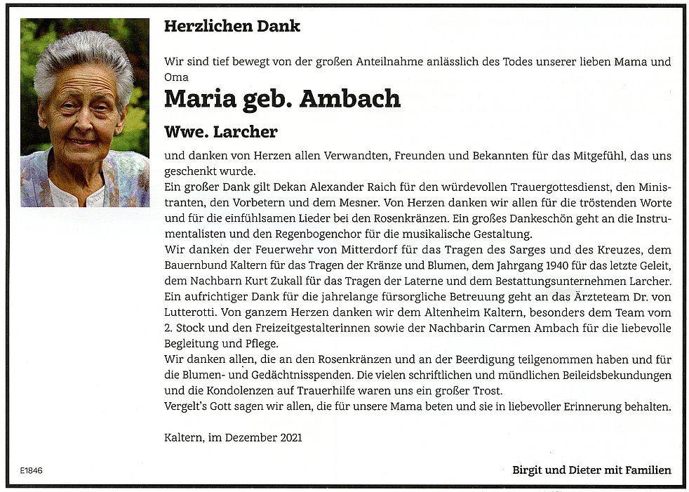 Ein aufrichtiger Dank geht an das Ärzteteam Dr. v. Lutterotti sowie an die Abteilungen Kardiologie und Medizin am Krankenhaus Bozen. Herzlichen Dank dem Altenheim Kaltern, besonders den Mitarbeitern vom 2. Stock und der Nachbarin Carmen für die liebevolle Betreuung unserer Mama.