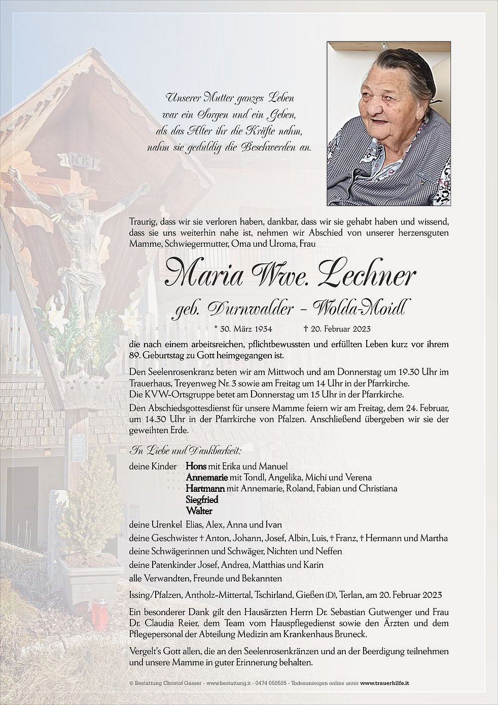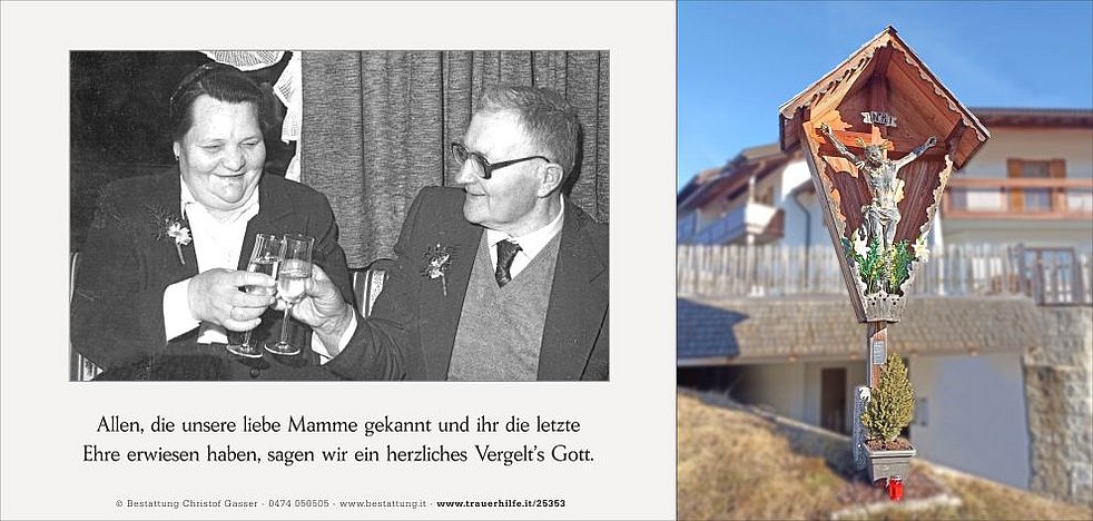 Den Abschiedsgottesdienst für unsere Mamme feiern wir am Freitag, dem 24. Februar, um 14.30 Uhr in der Pfarrkirche von Pfalzen. Anschließend übergeben wir sie der geweihten Erde.