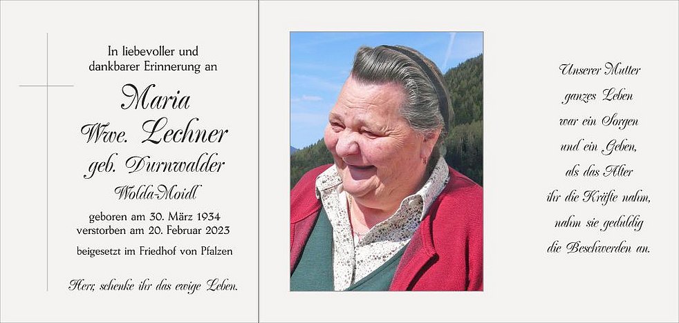 Vergelt’s Gott allen, die an den Seelenrosenkränzen und an der Beerdigung teilnehmen und unsere Mamme in guter Erinnerung behalten.