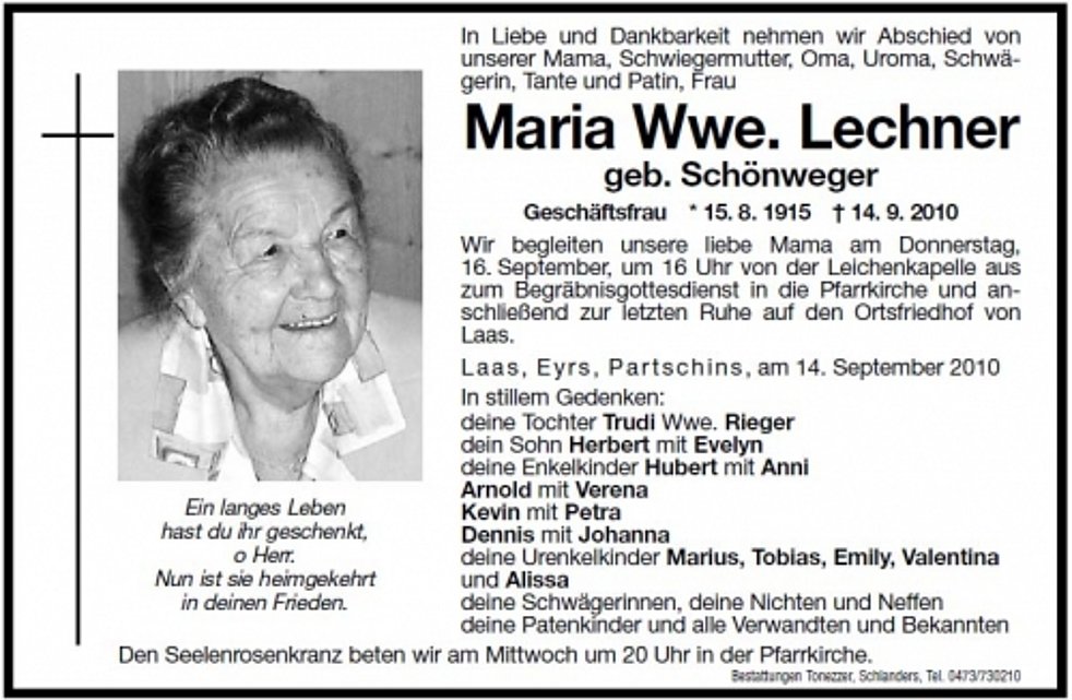 Wir begleiten unsere liebe Mama am Donnerstag, 16. September um 16 Uhr von der Leichenkapelle aus zum Begräbnisgottesdienst in die Pfarrkirche und anschließend zur letzten Ruhe auf den Ortsfriedhof von Laas.