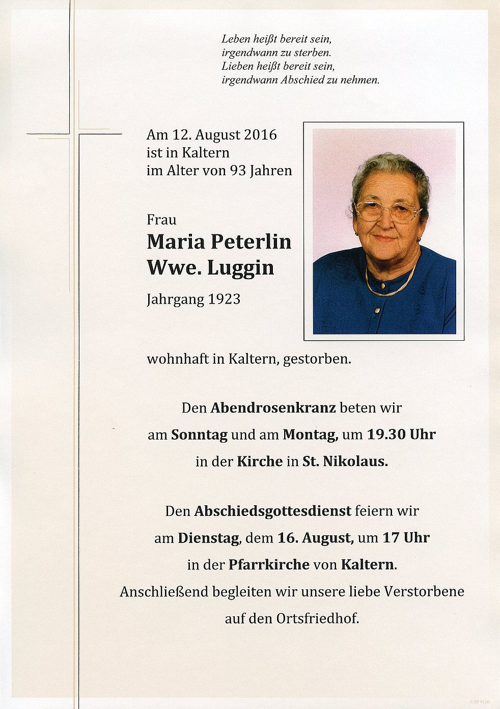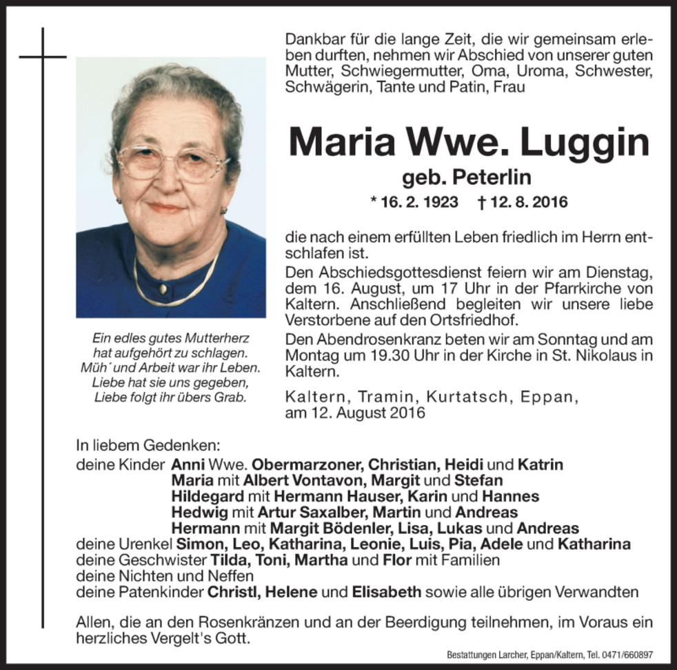 Den Abschiedsgottesdienst feiern wir am Dienstag, dem 16. August um 17 Uhr in der Pfarrkirche von Kaltern. Anschließend begleiten wir unsere liebe Verstorbene auf den Ortsfriedhof.