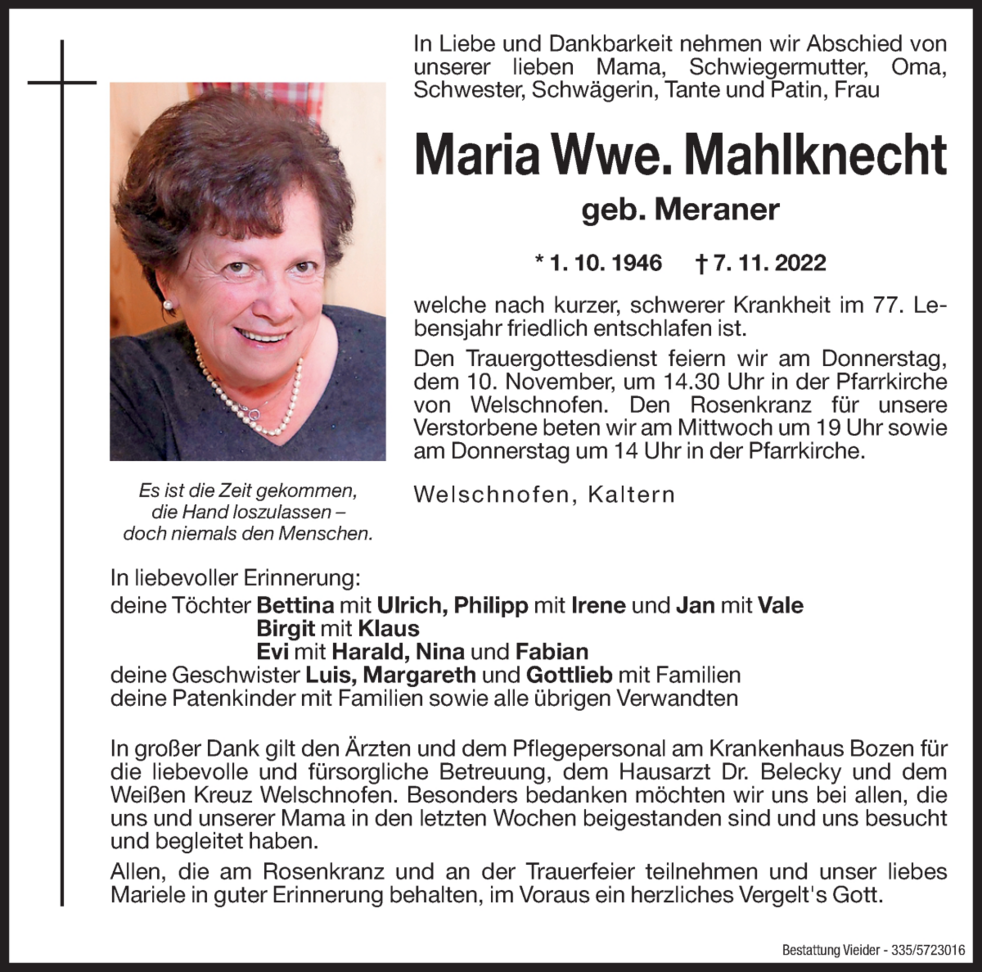 Ein großer Dank gilt den Ärzten und dem Pflegepersonal am Krankenhaus Bozen für die liebevolle und fürsorgliche Betreuung, dem Hausarzt Dr. Belecky und dem Weißen Kreuz Welschnofen. Besonders bedanken möchten wir uns bei allen, die uns und unserer Mama in den letzten Wochen beigestanden sind und uns besucht und begleitet haben.