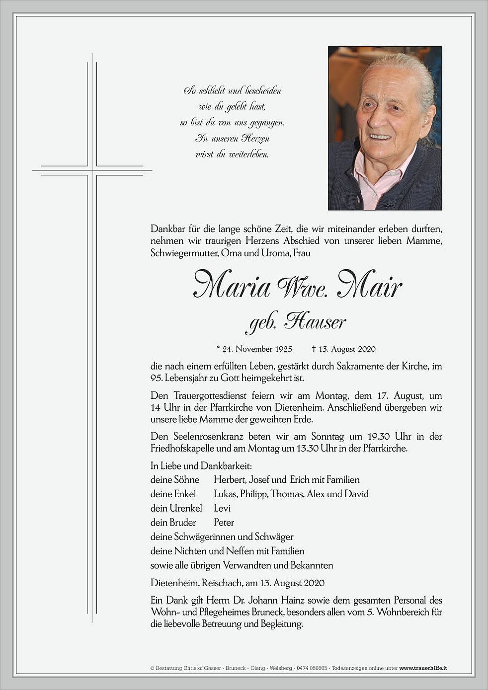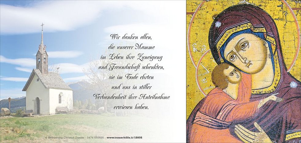 Ein Dank gilt Herrn Dr. Johann Hainz sowie dem gesamten Personal des Wohn- und Pflegeheimes Bruneck, besonders allen vom 5. Wohnbereich für die liebevolle Betreuung und Begleitung.