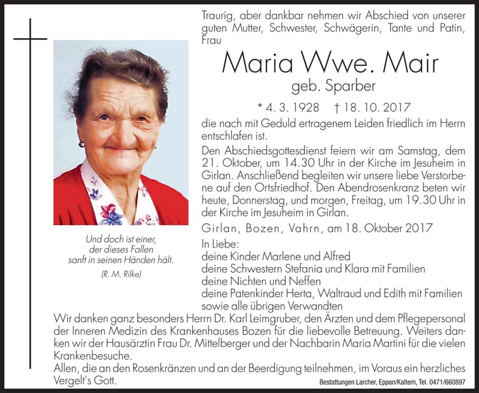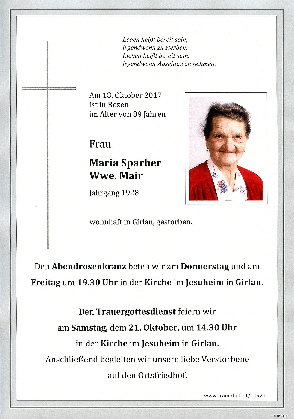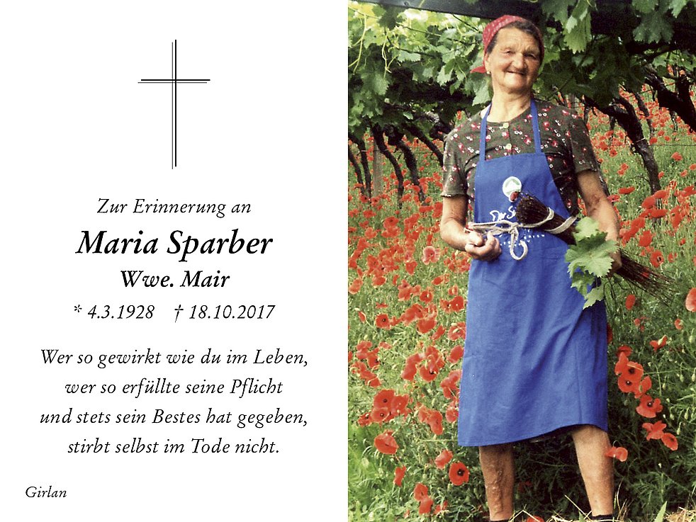 Den Abschiedsgottesdienst feiern wir am Samstag, dem 21. Oktober um 14.30 Uhr in der Kirche im Jesuheim in Girlan. Anschließend begleiten wir unsere liebe Verstorbene auf den Ortsfriedhof.