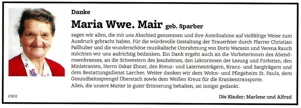 Wir danken ganz besonders Herrn Dr. Karl Leimgruber, den Ärzten und dem Pflegepersonal der Inneren Medizin des Krankenhauses Bozen für die liebevolle Betreuung. Weiters danken wir der Hausärztin Frau Dr. Mittelberger und der Nachbarin Maria Martini für die vielen Krankenbesuche.