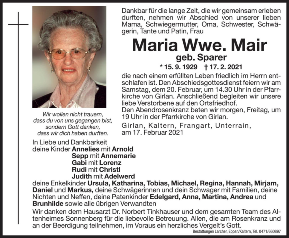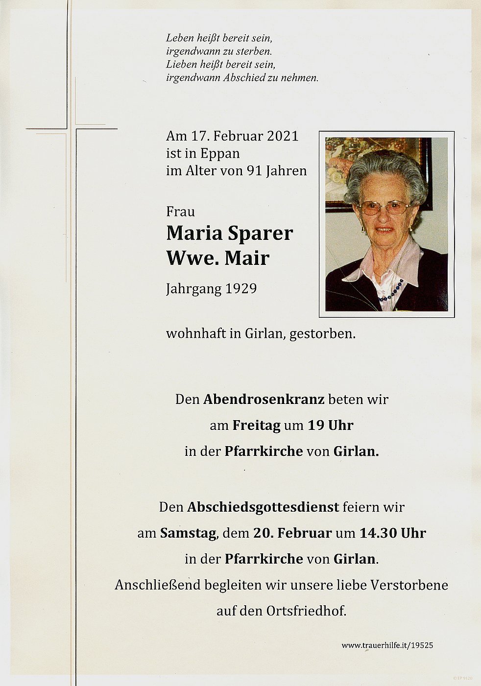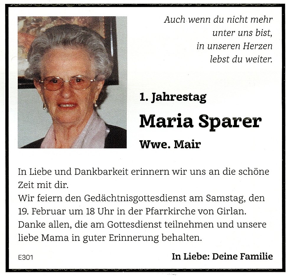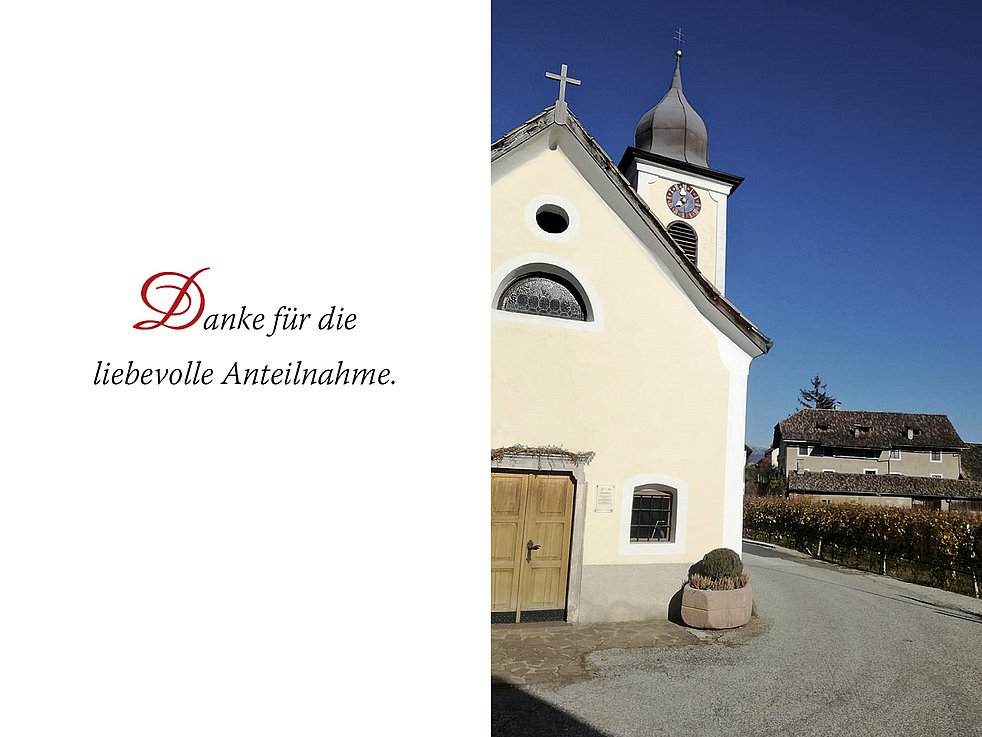 Den Abschiedsgottesdienst feiern wir am Samstag, dem 20. Februar um 14.30 Uhr in der Pfarrkirche von Girlan. Anschließend begleiten wir unsere liebe Verstorbene auf den Ortsfriedhof.