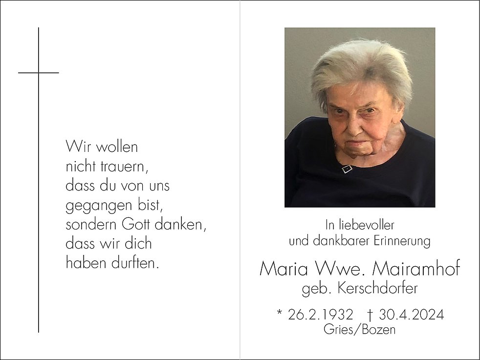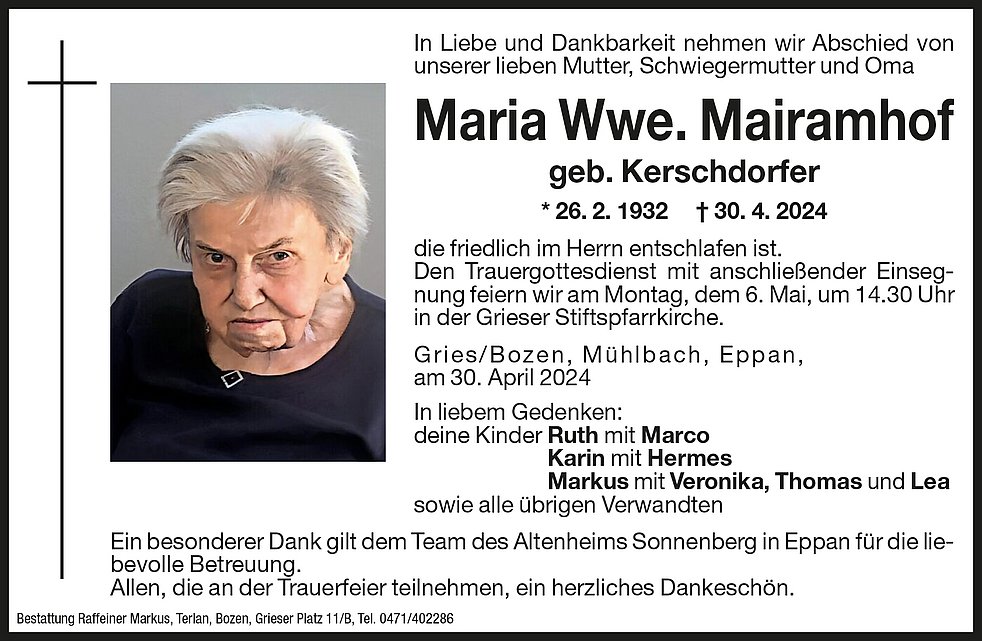 Den Trauergottesdienst mit anschließender Einsegnung feiern wir am Montag, dem 6. Mai, um 14.30 Uhr in der Grieser Stiftspfarrkirche.