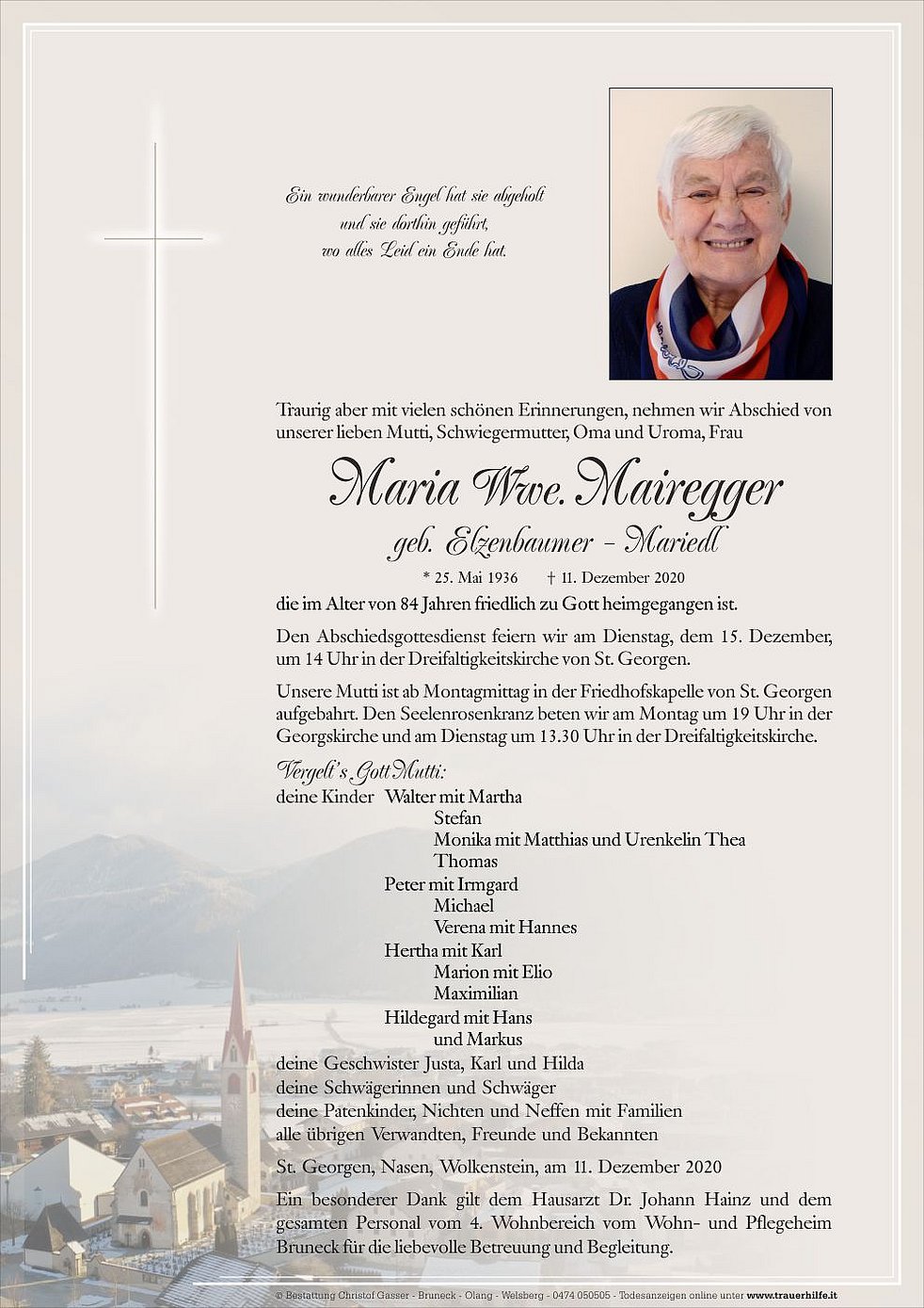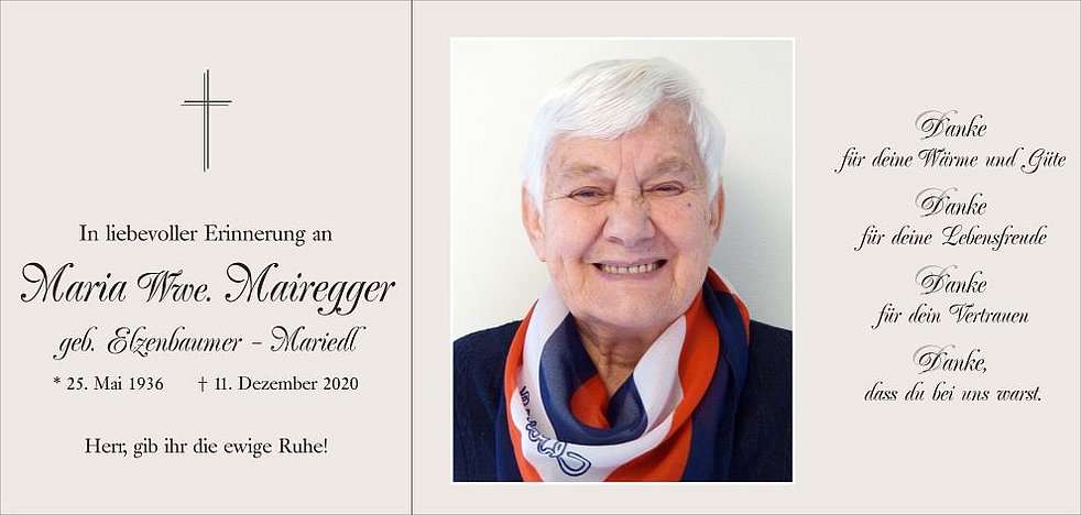 Unsere Mutti ist ab Montagmittag in der Friedhofskapelle von St. Georgen aufgebahrt. Den Seelenrosenkranz beten wir am Montag um 19 Uhr in der Georgskirche und am Dienstag um 13.30 Uhr in der Dreifaltigkeitskirche.