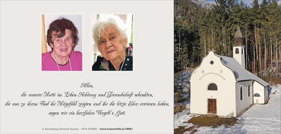 Ein besonderer Dank gilt dem Hausarzt Dr. Johann Hainz und dem gesamten Personal vom 4. Wohnbereich vom Wohn- und Pflegeheim Bruneck für die liebevolle Betreuung und Begleitung.