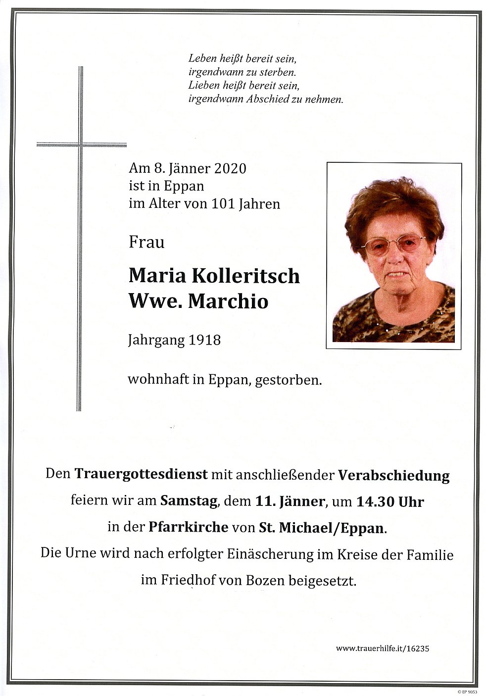Den Trauergottesdienst mit anschließender Verabschiedung feiern wir am Samstag, dem 11. Jänner um 14.30 Uhr in der Pfarrkirche von St. Michael/Eppan.