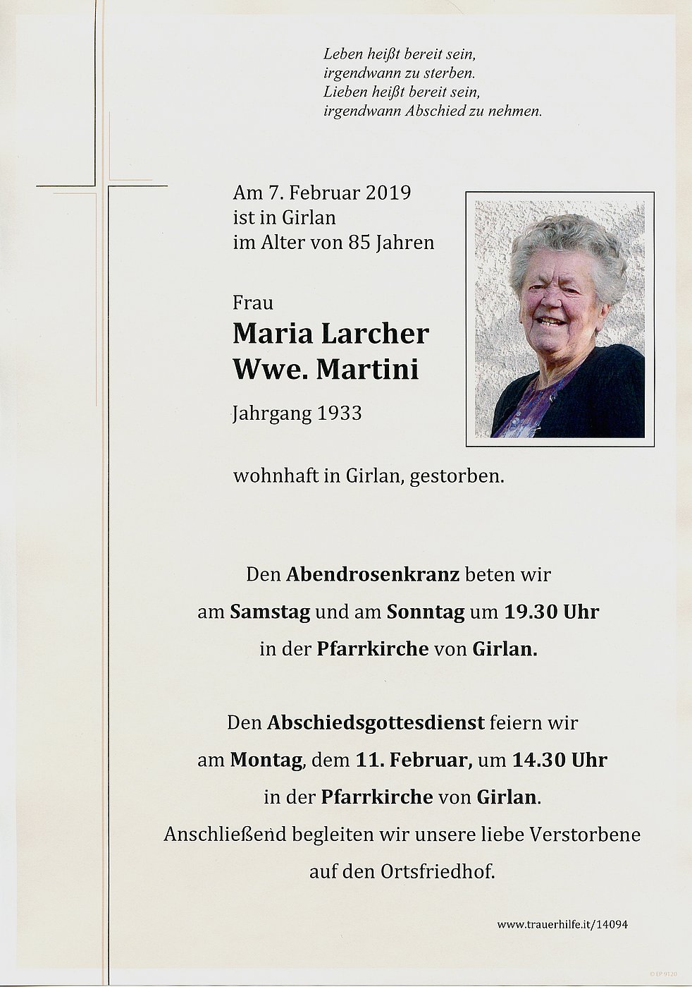 Den Abschiedsgottesdienst feiern wir am Montag, dem 11. Februar um 14.30 Uhr in der Pfarrkirche von Girlan. Anschließend begleiten wir unsere liebe Verstorbene auf den Ortsfriedhof.
