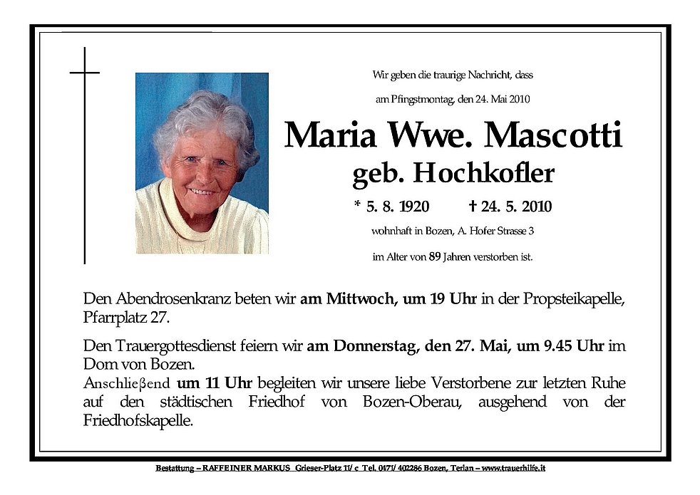 Den Trauergottesdienst feiern wir am Donnerstag, dem 27. Mai, um 9.45 Uhr im Dom von Bozen; anschlieβend um 11 Uhr begleiten wir unsere liebe Verstorbene zur letzten Ruhe auf den städtischen Friedhof von Bozen-Oberau, ausgehend von der Friedhofskapelle.