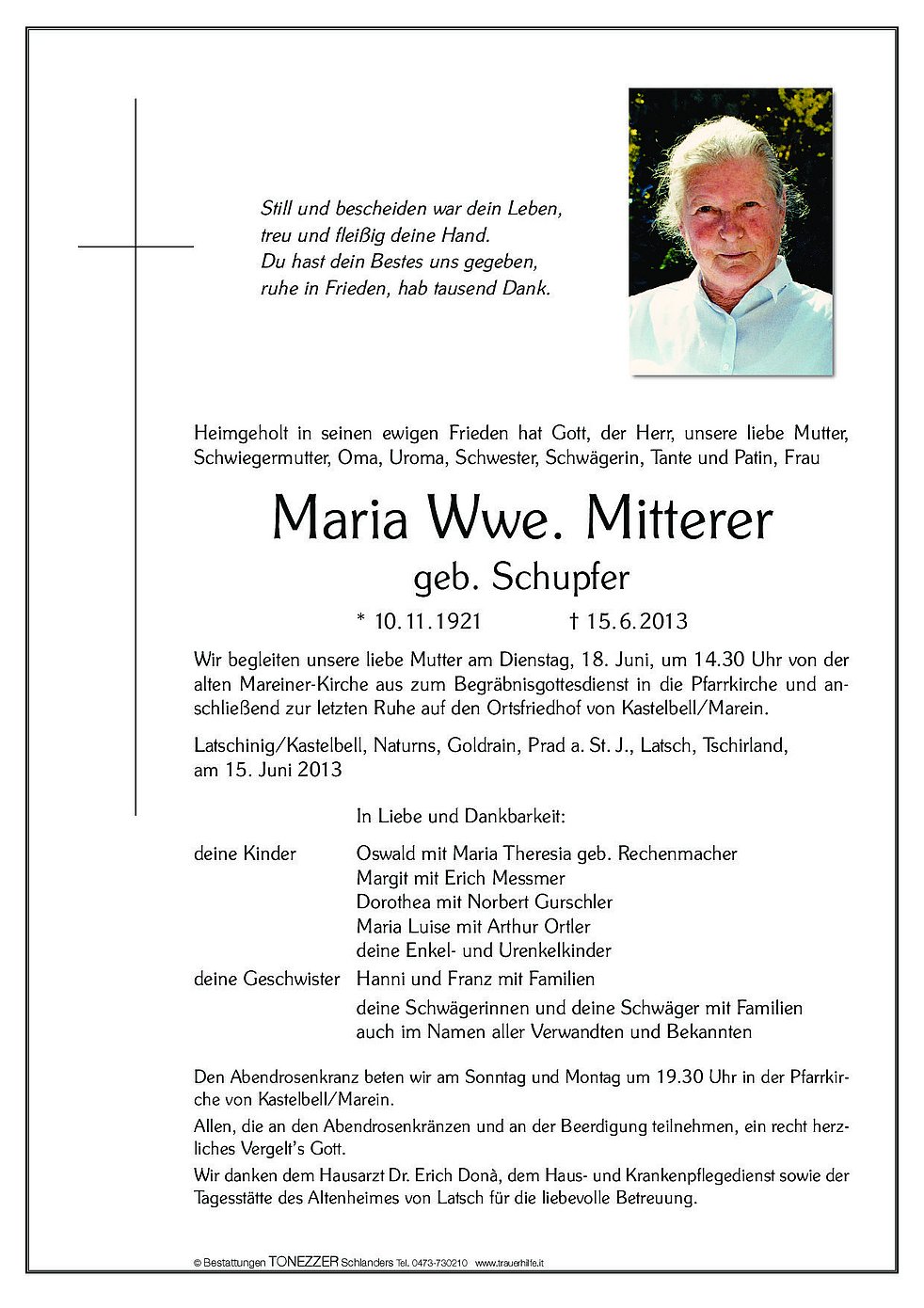 Wir begleiten unsere liebe Mutter am Dienstag, 18. Juni, um 14.30 Uhr von der alten Mareiner-Kirche aus zum Begräbnisgottesdienst in die Pfarrkirche und anschließend zur letzten Ruhe auf den Ortsfriedhof von Kastelbell/Marein.