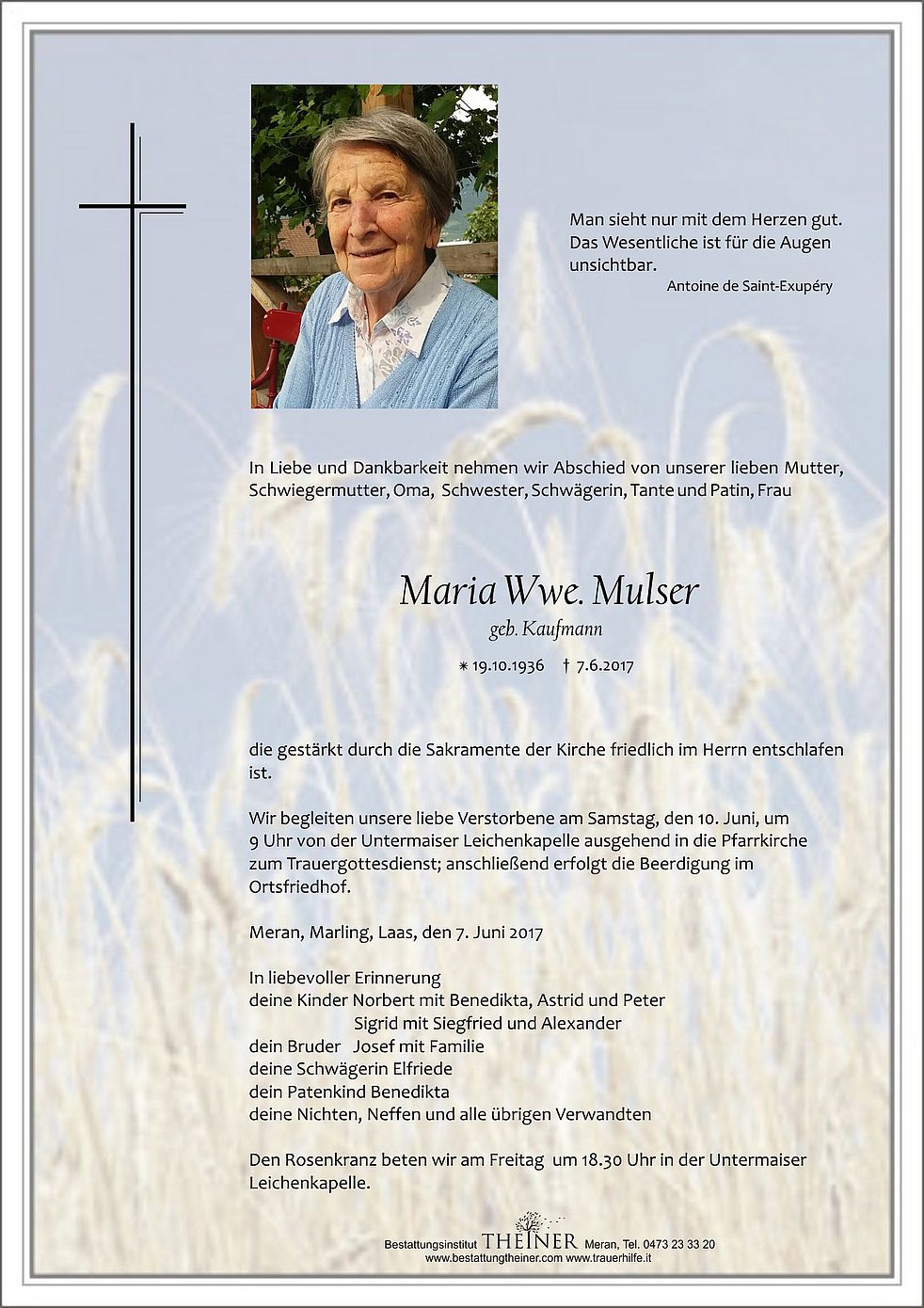 Wir begleiten unsere liebe Verstorbene am Samstag, den 10. Juni, um 9 Uhr von der Untermaiser Leichenkapelle ausgehend in die Pfarrkirche zum Trauergottesdienst; anschließend erfolgt die Beerdigung im Ortsfriedhof.