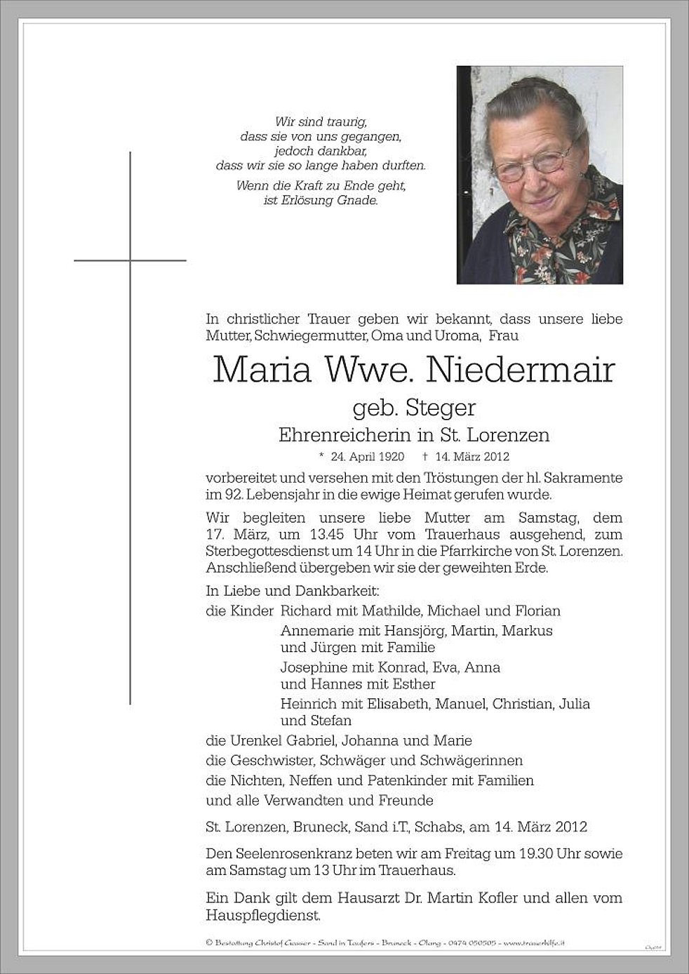 17. März, um 13.45 Uhr vom Trauerhaus ausgehend, zum Sterbegottesdienst um 14 Uhr in die Pfarrkirche von St. Lorenzen. Anschließend übergeben wir sie der geweihten Erde.