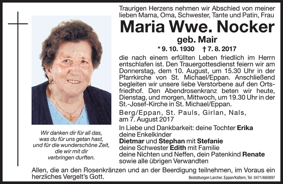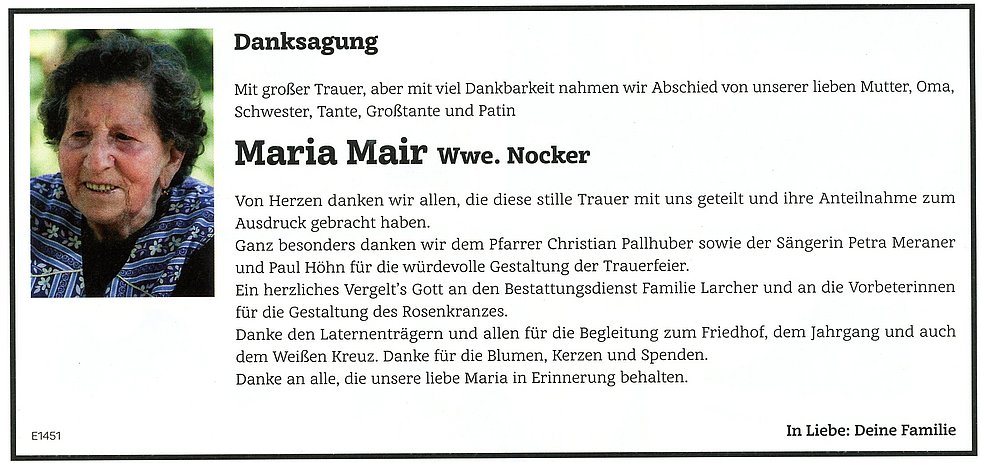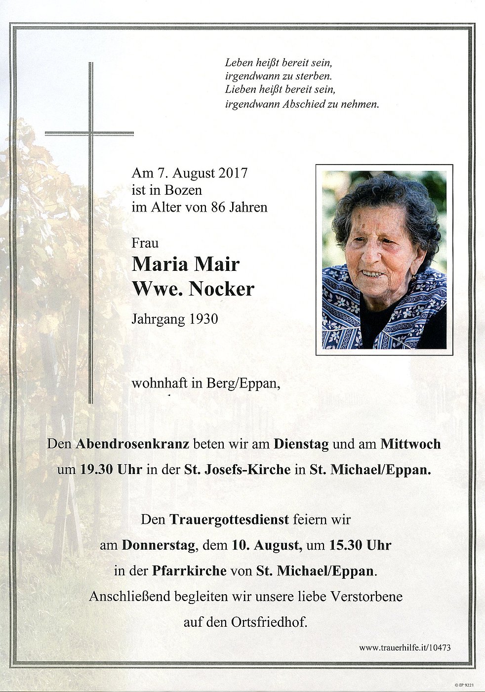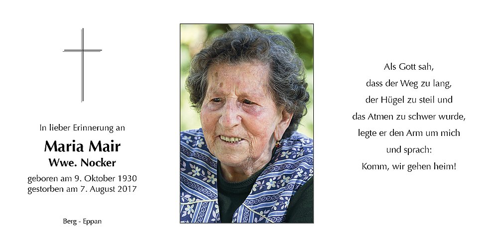 Den Trauergottesdienst feiern wir am Donnerstag, dem 10. August um 15.30 Uhr in der Pfarrkirche von St. Michael/Eppan. Anschließend begleiten wir unsere liebe Verstorbene auf den Ortsfriedhof.