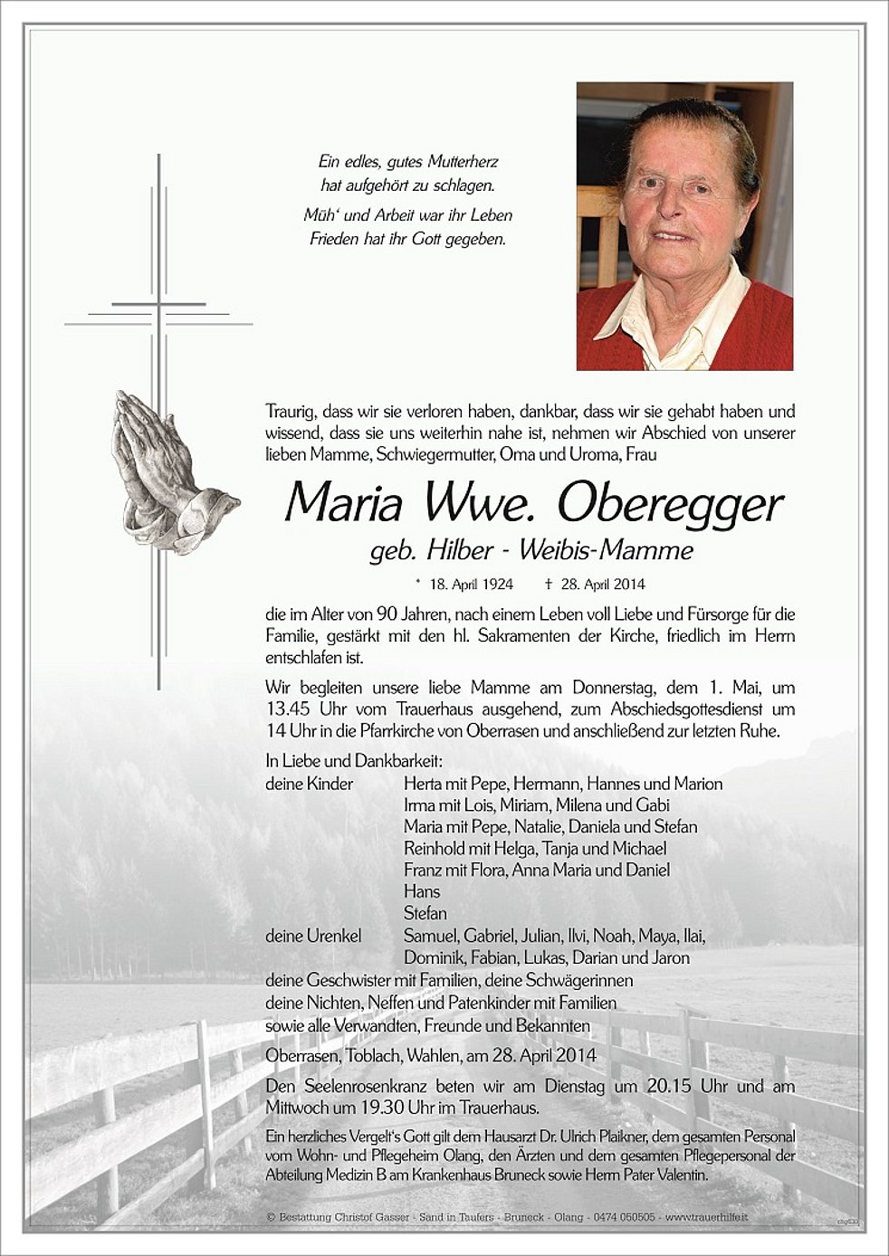 14 Uhr in die Pfarrkirche von Oberrasen und anschließend zur letzten Ruhe.