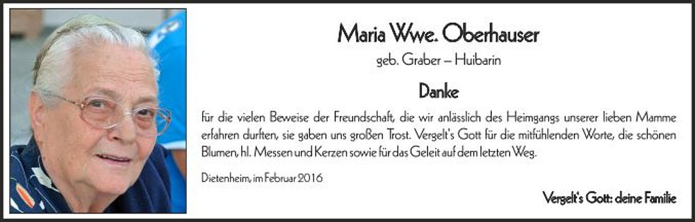 für die vielen Beweise der Freundschaft, die wir anlässlich des Heimgangs unserer lieben Mamme erfahren durften, sie gaben uns großen Trost. Vergelt‘s Gott für die mitfühlenden Worte, die schönen Blumen, hl. Messen und Kerzen sowie für das Geleit auf dem letzten Weg.