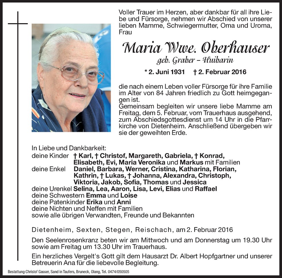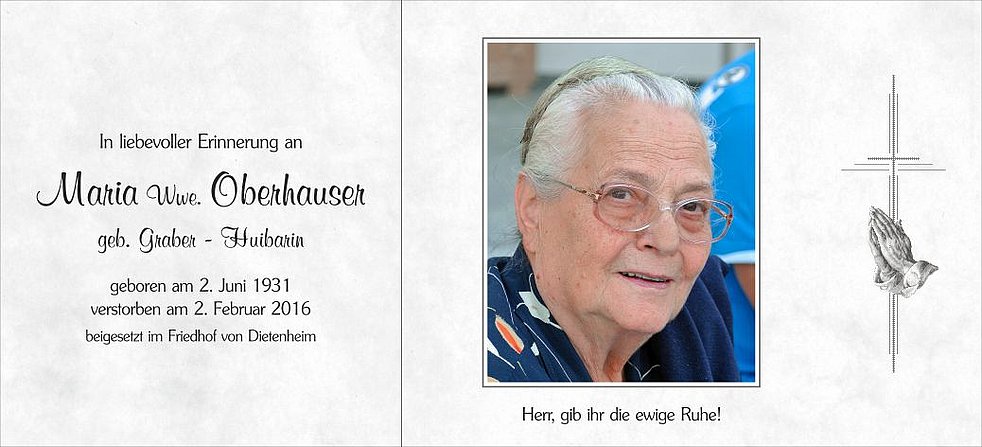 Gemeinsam begleiten wir unsere liebe Mamme am Freitag, dem 5. Februar, vom Trauerhaus ausgehend, zum Abschiedsgottesdienst um 14 Uhr in die Pfarrkirche von Dietenheim. Anschließend übergeben wir sie der geweihten Erde.