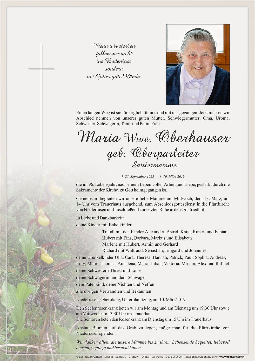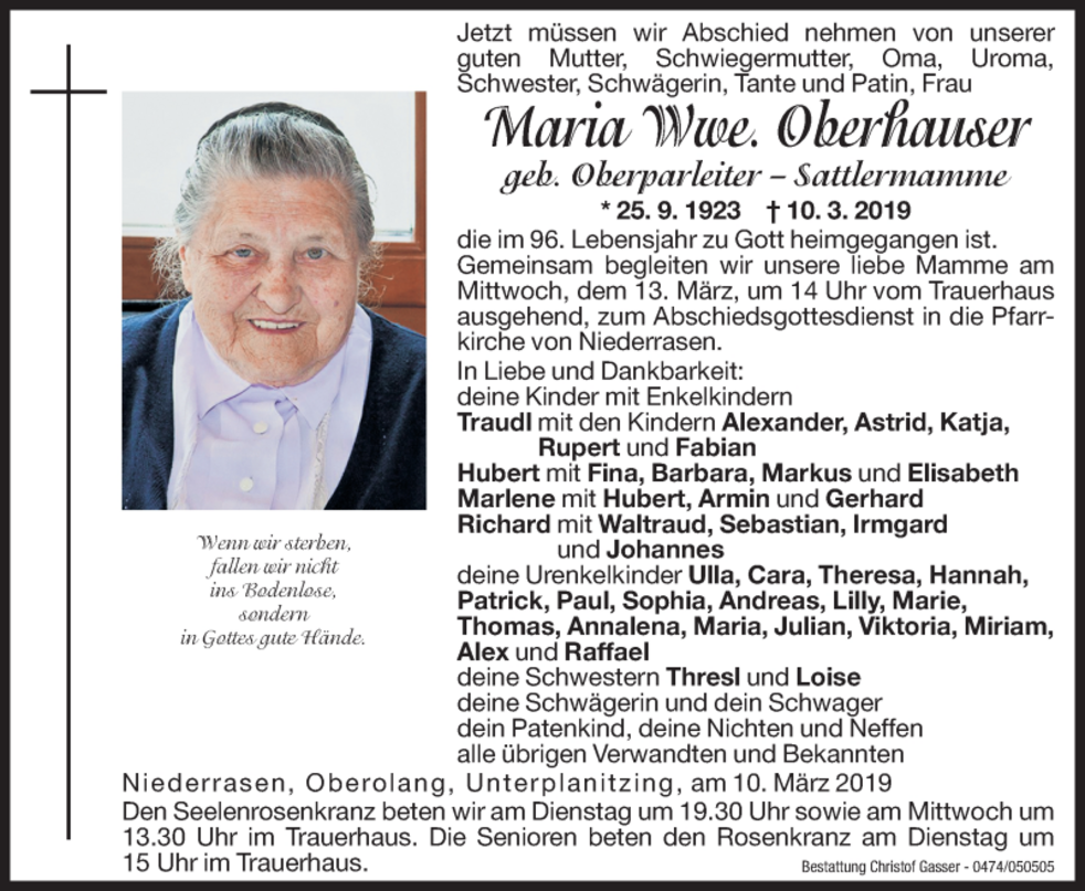 Gemeinsam begleiten wir unsere liebe Mamme am Mittwoch, dem 13. März, um 14 Uhr vom Trauerhaus ausgehend, zum Abschiedsgottesdienst in die Pfarrkirche von Niederrasen und anschließend zur letzten Ruhe in den Ortsfriedhof.