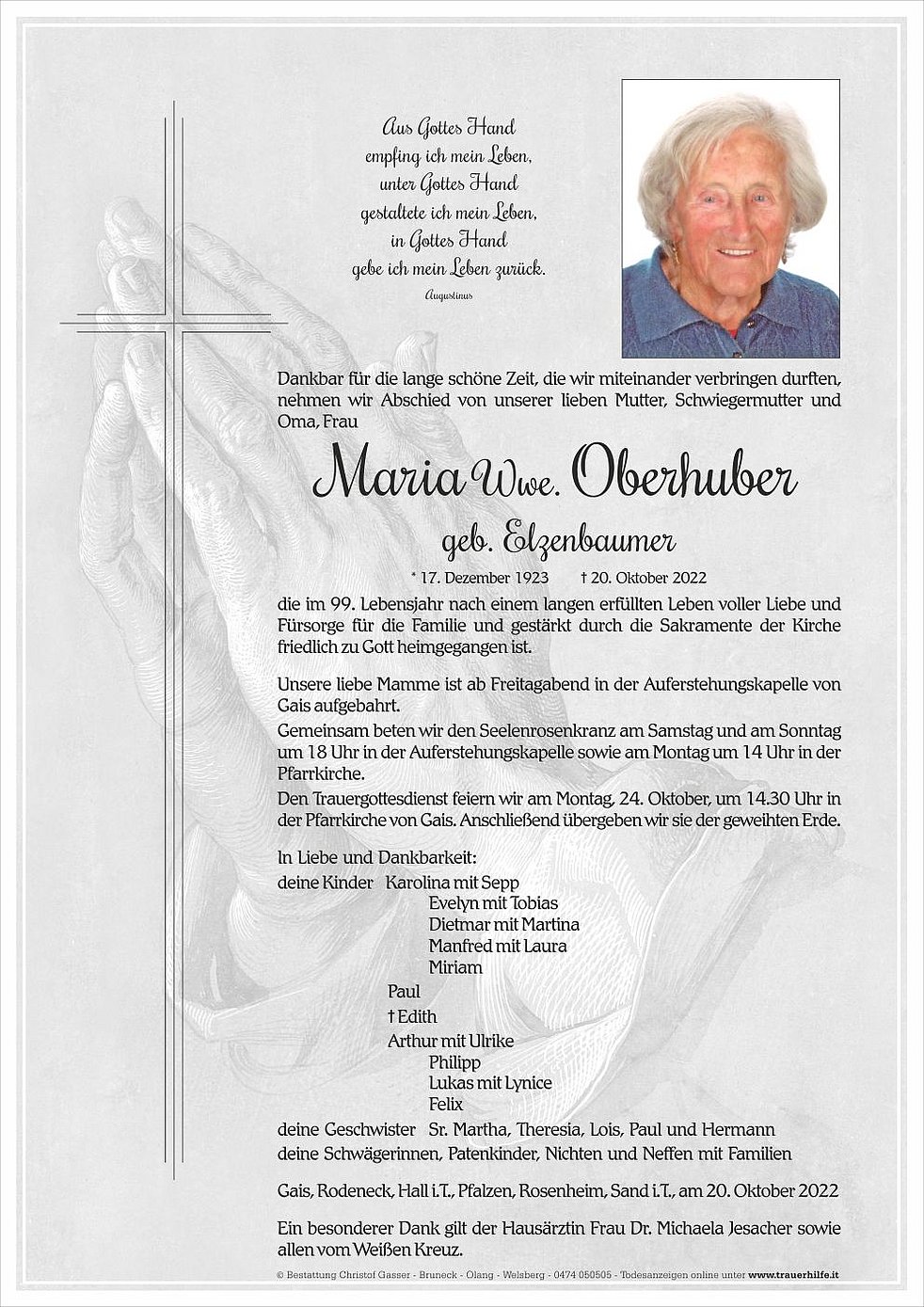1958 ehelichte sie Josef Oberhuber aus Lappach, zusammen hatten sie 4 Kinder. Die Familie wohnte in Mühlen in Taufers, bis sie 1969 nach Gais zogen, um dort eine Tischlerei zu betreiben.