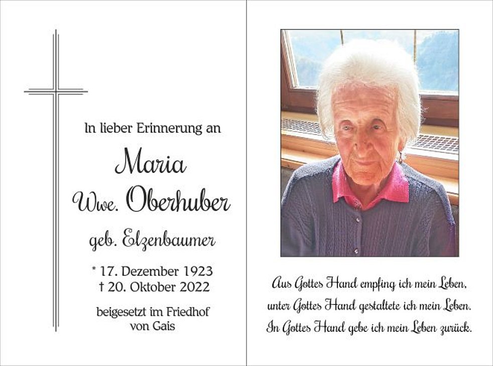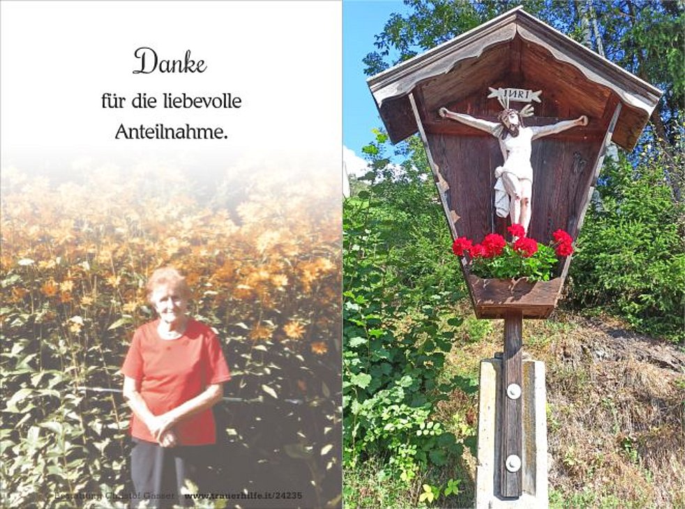 Den Trauergottesdienst feiern wir am Montag, 24. Oktober, um 14.30 Uhr in der Pfarrkirche von Gais. Anschließend übergeben wir sie der geweihten Erde.