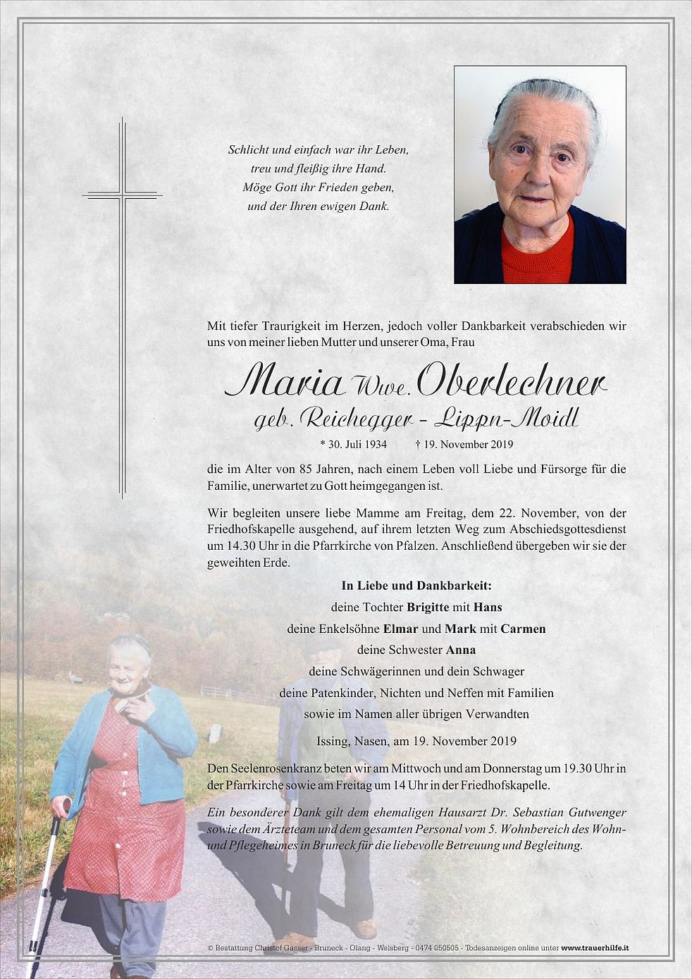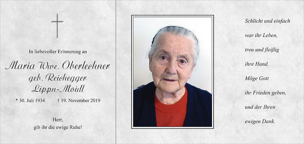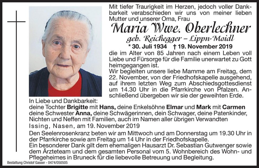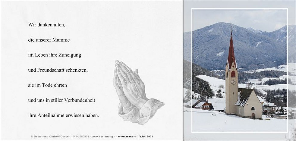 Wir begleiten unsere liebe Mamme am Freitag, dem 22. November, von der Friedhofskapelle ausgehend, auf ihrem letzten Weg zum Abschiedsgottesdienst um 14.30 Uhr in die Pfarrkirche von Pfalzen. Anschließend übergeben wir sie der geweihten Erde.