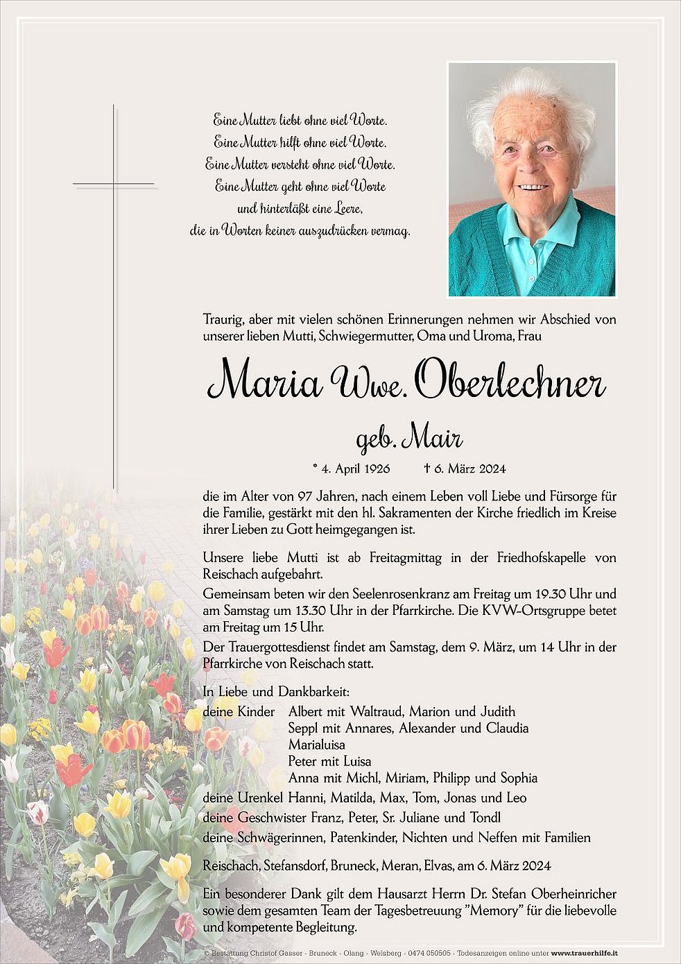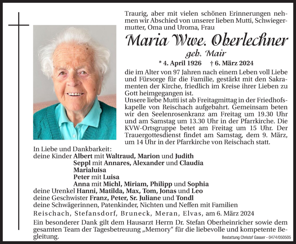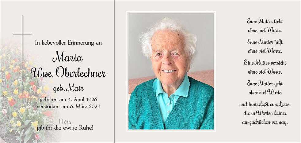 die im Alter von 97 Jahren, nach einem Leben voll Liebe und Fürsorge für die Familie, gestärkt mit den hl. Sakramenten der Kirche friedlich im Kreise ihrer Lieben zu Gott heimgegangen ist.