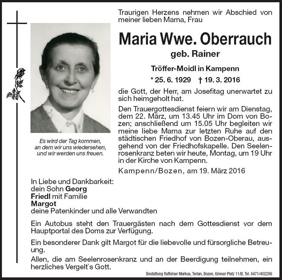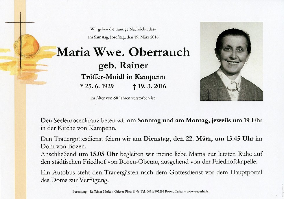 Den Trauergottesdienst feiern wir am Dienstag, den 22. März, um 13.45 Uhr im Dom von Bozen; anschlieβend um 15.05 Uhr begleiten wir meine liebe Mama zur letzten Ruhe auf den städtischen Friedhof von Bozen-Oberau, ausgehend von der Friedhofskapelle.