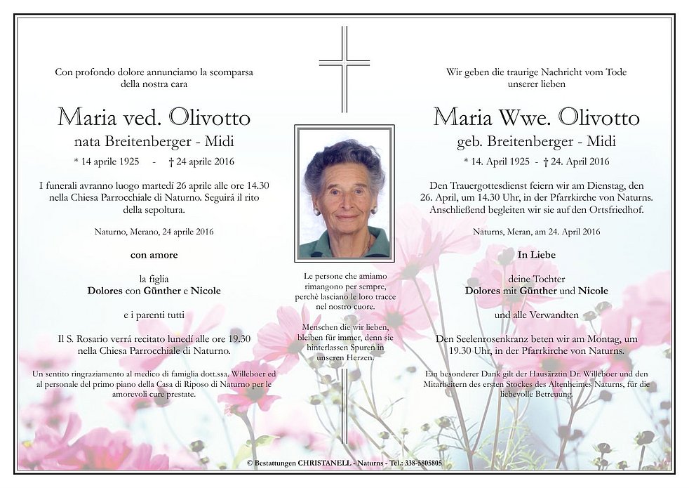 Un sentito ringraziamento al medico di famiglia dott.ssa. Willeboer ed al personale del primo piano della Casa di Riposo di Naturno per le amorevoli cure prestate.