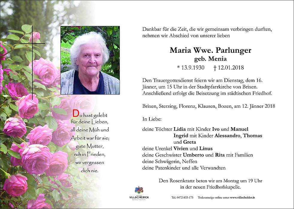 Den Trauergottesdienst feiern wir am Dienstag, dem 16. Jänner, um 15 Uhr in der Stadtpfarrkirche von Brixen.