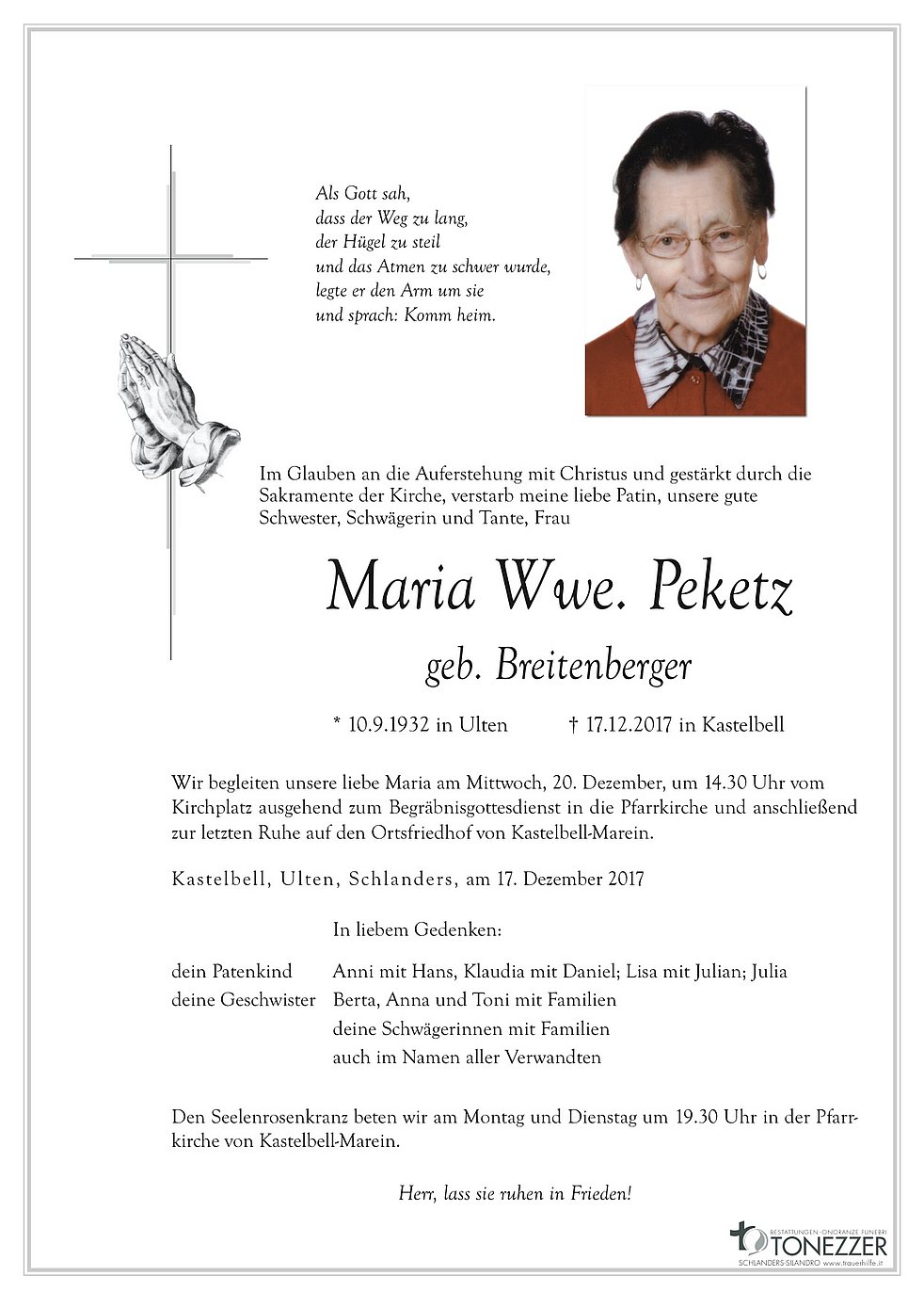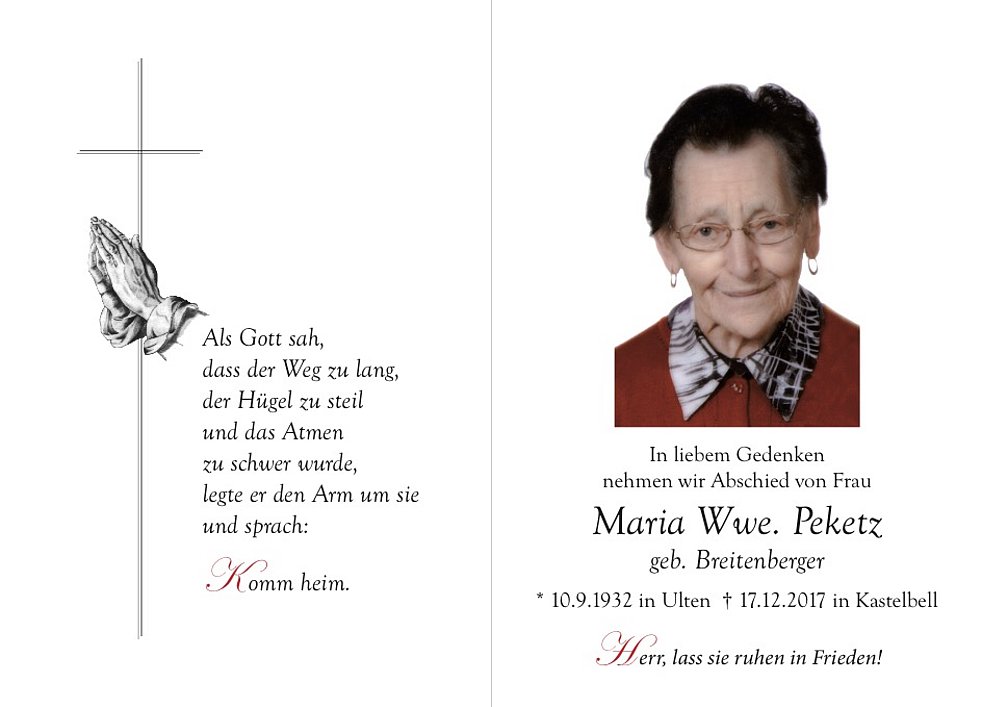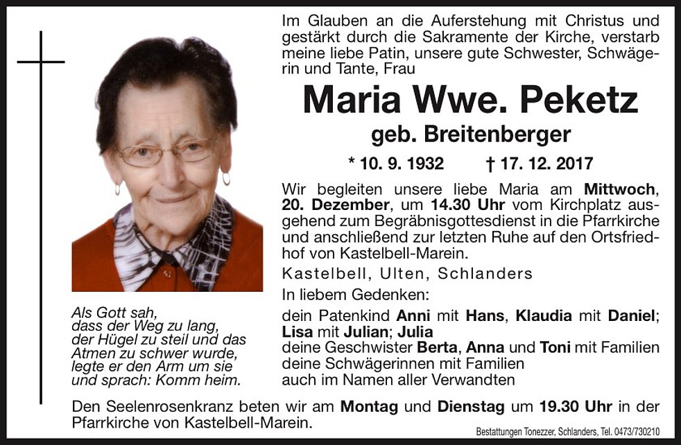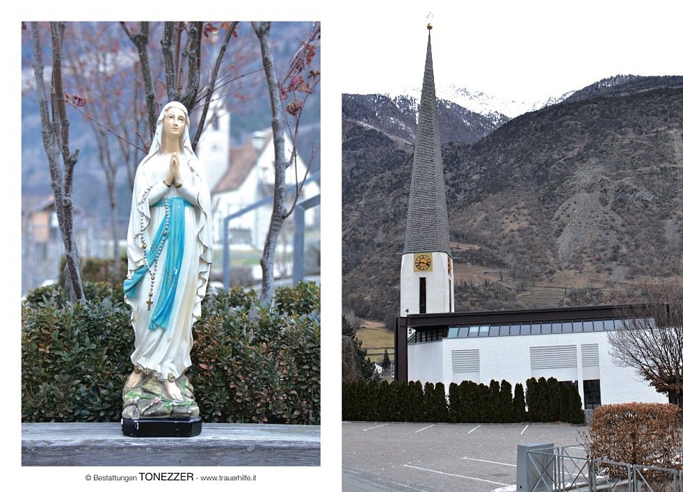 Wir begleiten unsere liebe Maria am Mittwoch, 20. Dezember, um 14.30 Uhr vom Kirchplatz ausgehend zum Begräbnisgottesdienst in die Pfarrkirche und anschließend zur letzten Ruhe auf den Ortsfriedhof von Kastelbell-Marein.
