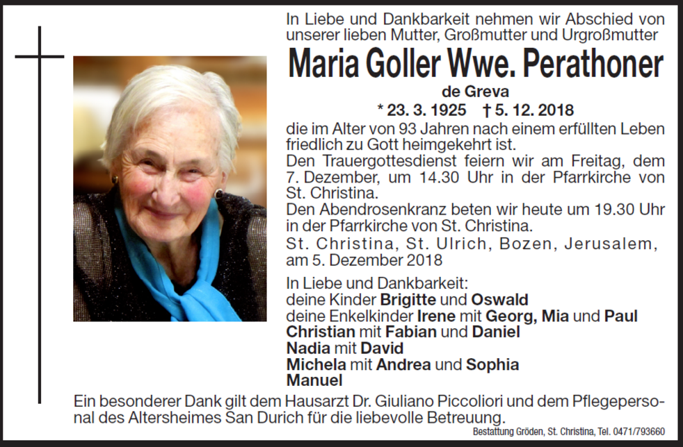 Ein besonderer Dank gilt Hausarzt Dr. Giuliano Piccoliori und dem Pflegepersonal des Altersheimes San Durich für die liebevolle Betreuung.