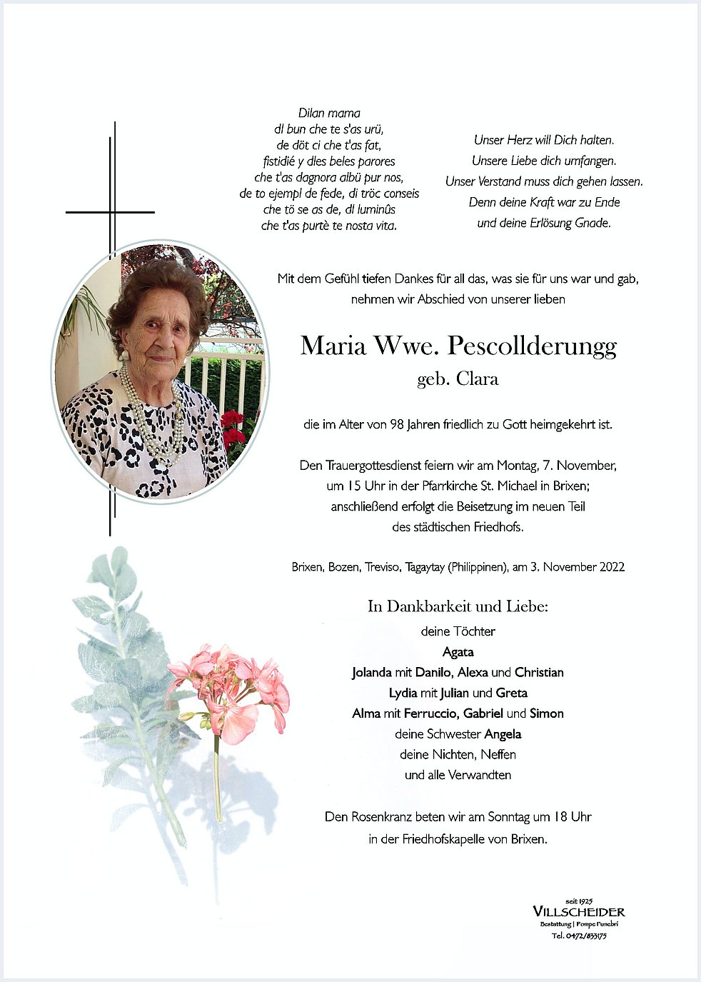 Cares Agata, Jolanda, Lydia y Alma, sontides condolianzes, che osta amada mama pôi se gòder le lominùs dleternitè. I se recordarun de üsc geniturs te nostes oraziuns.