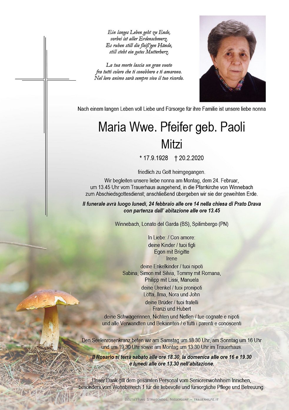 Wir begleiten unsere liebe nonna am Montag, dem 24. Februar, um 13.45 Uhr vom Trauerhaus ausgehend, in die Pfarrkirche von Winnebach zum Abschiedsgottesdienst; anschließend übergeben wir sie der geweihten Erde.