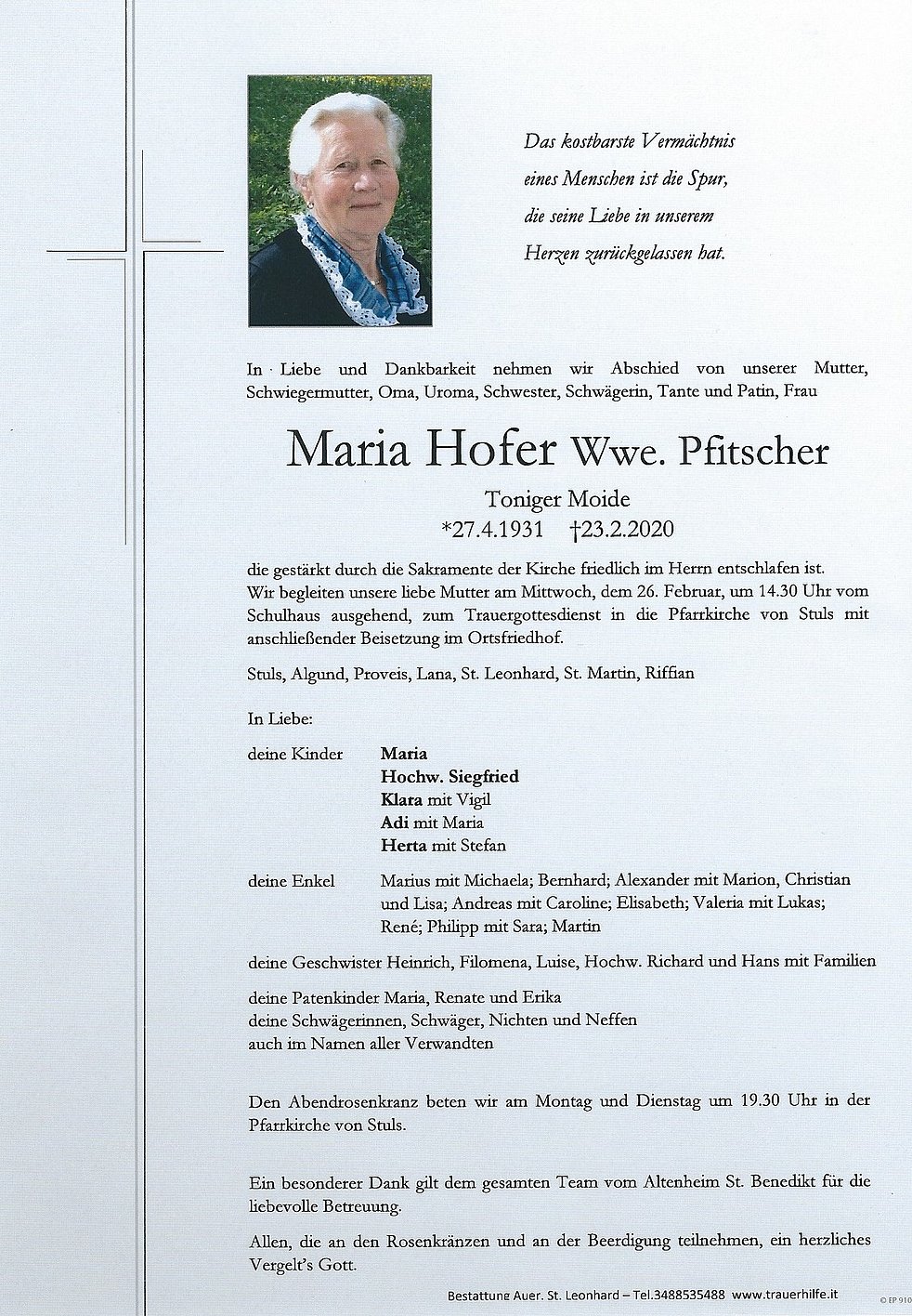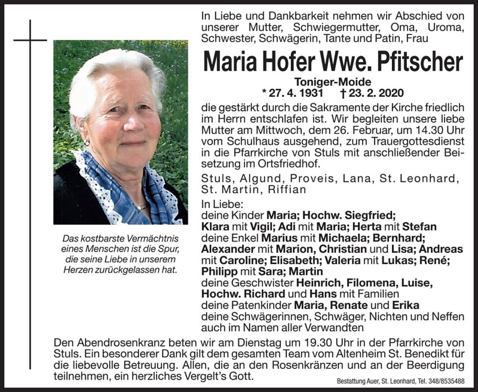 Wir begleiten unsere liebe Mutter am Mittwoch, dem 26. Februar, um 14.30 Uhr vom Schulhaus ausgehend, zum Trauergottesdienst in die Pfarrkirche von Stuls mit anschließender Beisetzung im Ortsfriedhof.