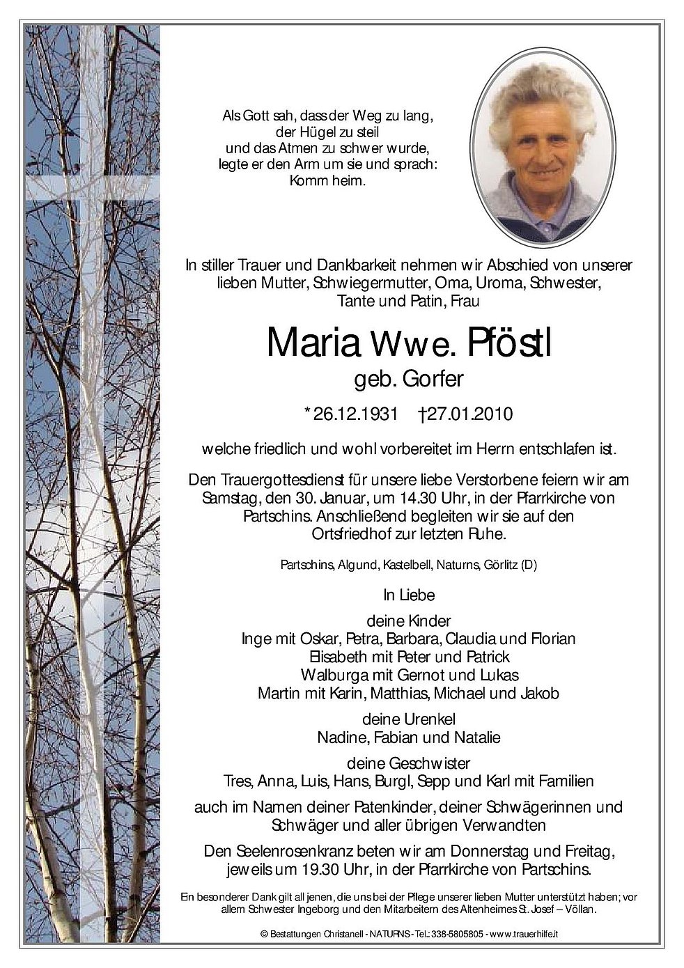 Den Trauergottesdienst für unsere liebe Verstorbene feiern wir am Samstag, den 30. Januar, um 14.30 Uhr, in der Pfarrkirche von Partschins. Anschließend begleiten wir sie auf den Ortsfriedhof zur letzten Ruhe.