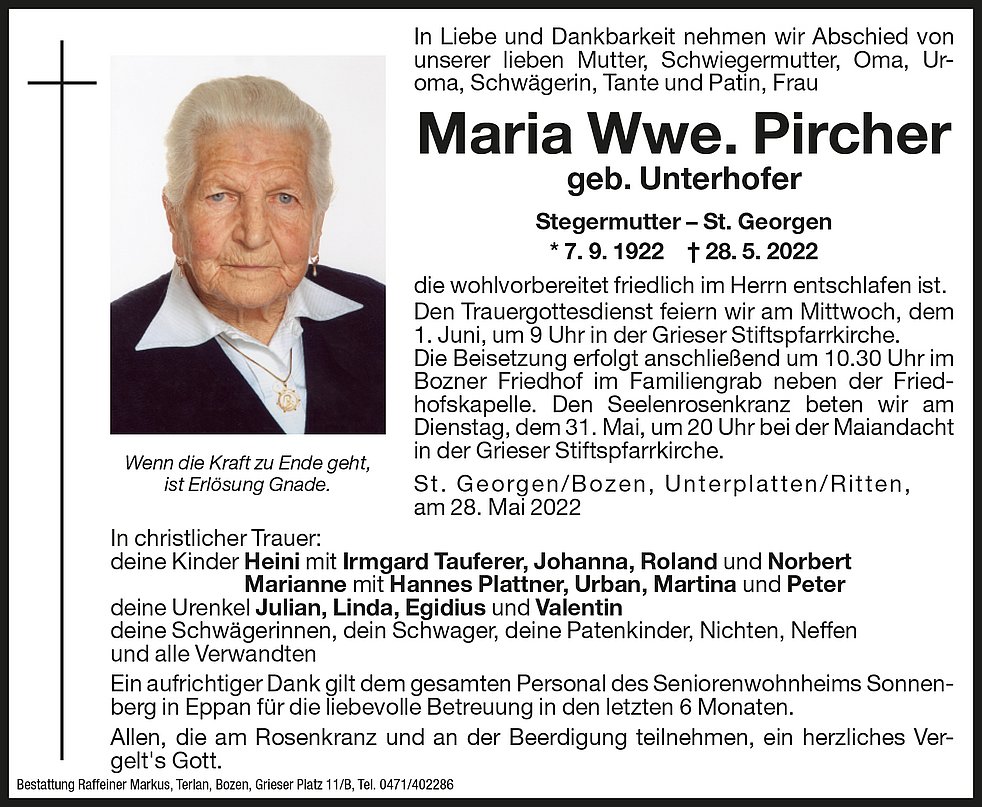 Den Trauergottesdienst feiern wir am Mittwoch, dem 1. Juni, um 9 Uhr in der Grieser Stiftspfarrkirche. Die Beisetzung erfolgt anschließend um 10.30 Uhr im Bozner Friedhof am Familiengrab neben der Friedhofskapelle.