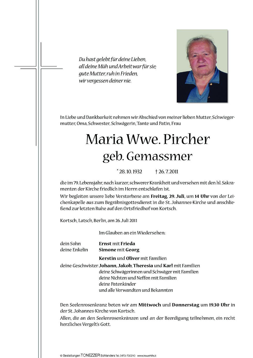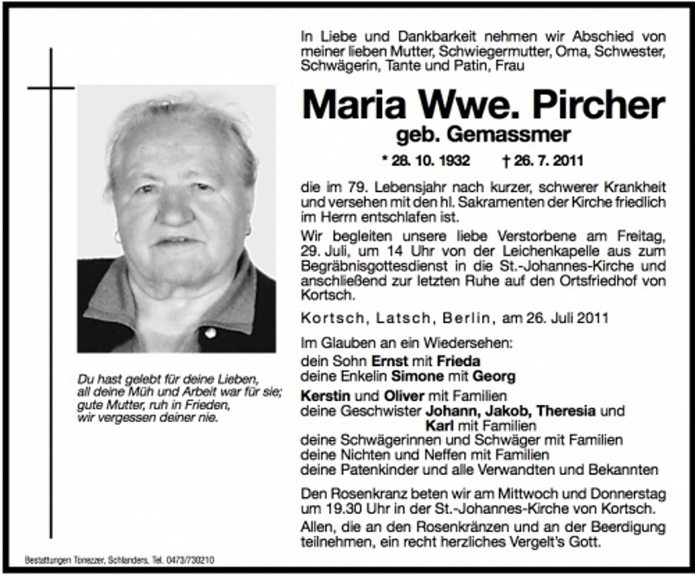 Wir begleiten unsere liebe Verstorbene am Freitag, 29. Juli, um 14 Uhr von der Leichenkapelle aus zum Begräbnisgottesdienst in die St. Johannes-Kirche und anschließend zur letzten Ruhe auf den Ortsfriedhof von Kortsch.