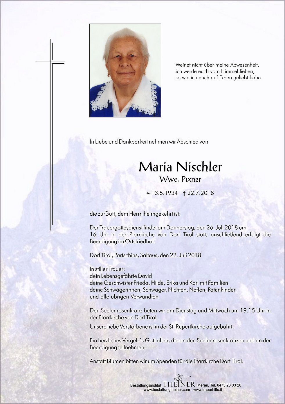Der Trauergottesdienst findet am Donnerstag, den 26. Juli 2018 um 16 Uhr in der Pfarrkirche von Dorf Tirol statt; anschließend erfolgt die Beerdigung im Ortsfriedhof.