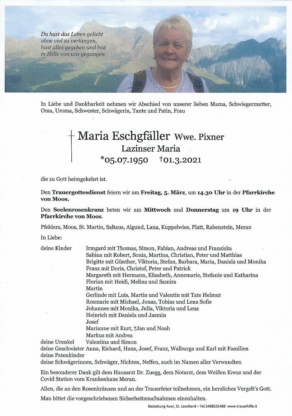 Ein besonderer Dank gilt dem Hausarzt Dr. Zuegg, dem Notarzt, dem Weißen Kreuz und der Covid Station vom Krankenhaus Meran.