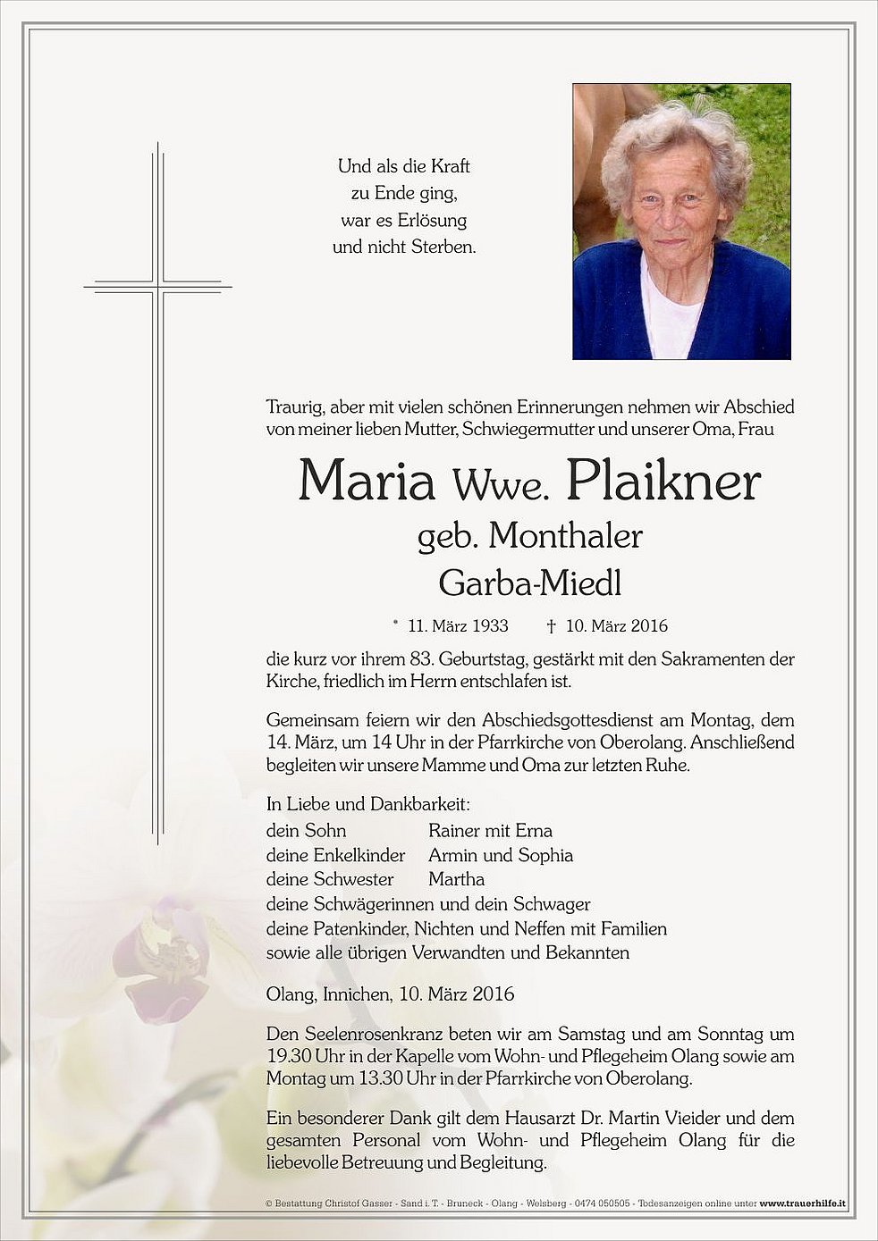 Gemeinsam feiern wir den Abschiedsgottesdienst am Montag, dem 14. März, um 14 Uhr in der Pfarrkirche von Oberolang. Anschließend begleiten wir unsere Mamme und Oma zur letzten Ruhe.