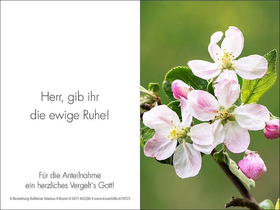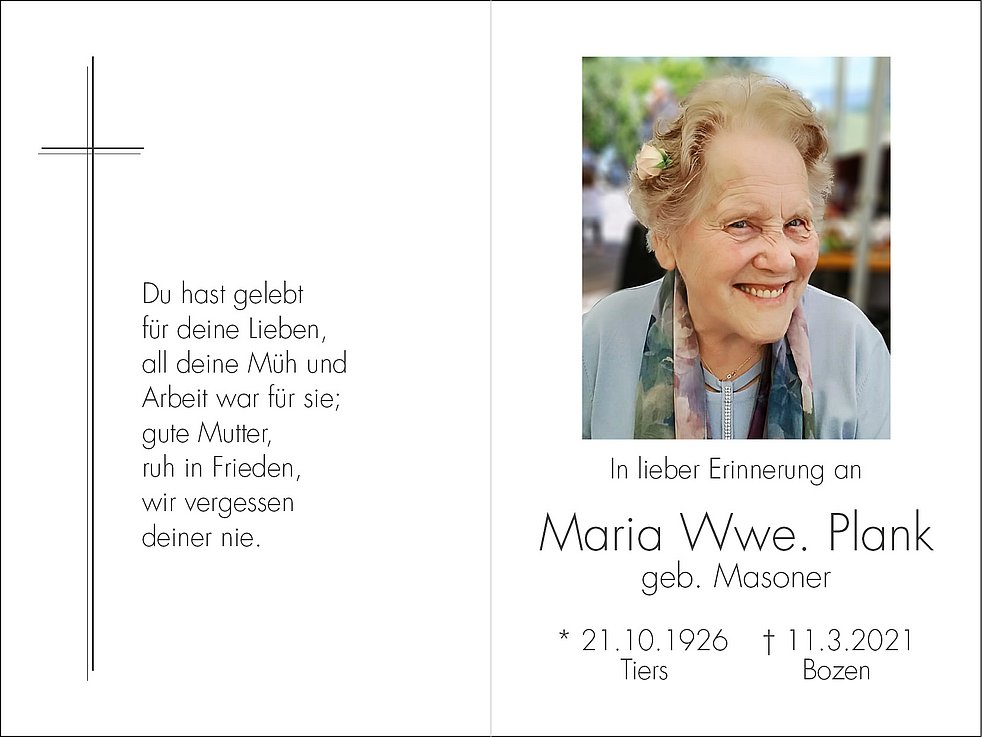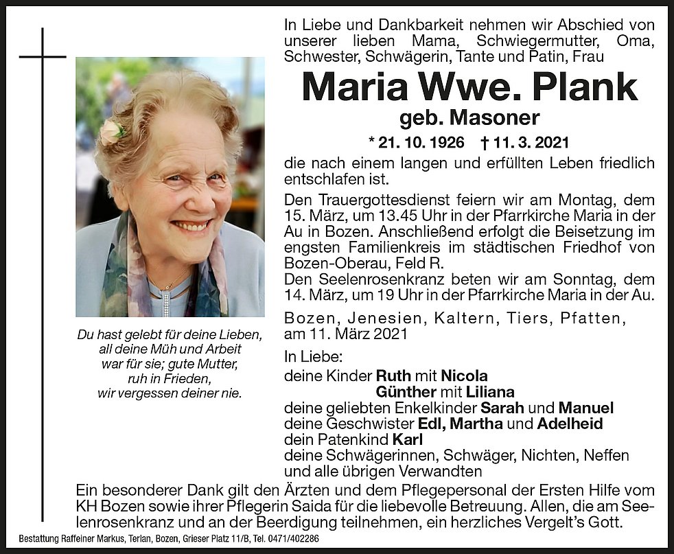 Den Trauergottesdienst feiern wir am Montag, dem 15. März, um 13.45 Uhr in der Pfarrkirche Maria in der Au in Bozen. Anschließend erfolgt die Beisetzung im engsten Familienkreis im städtischen Friedhof von Bozen/Oberau, Feld R